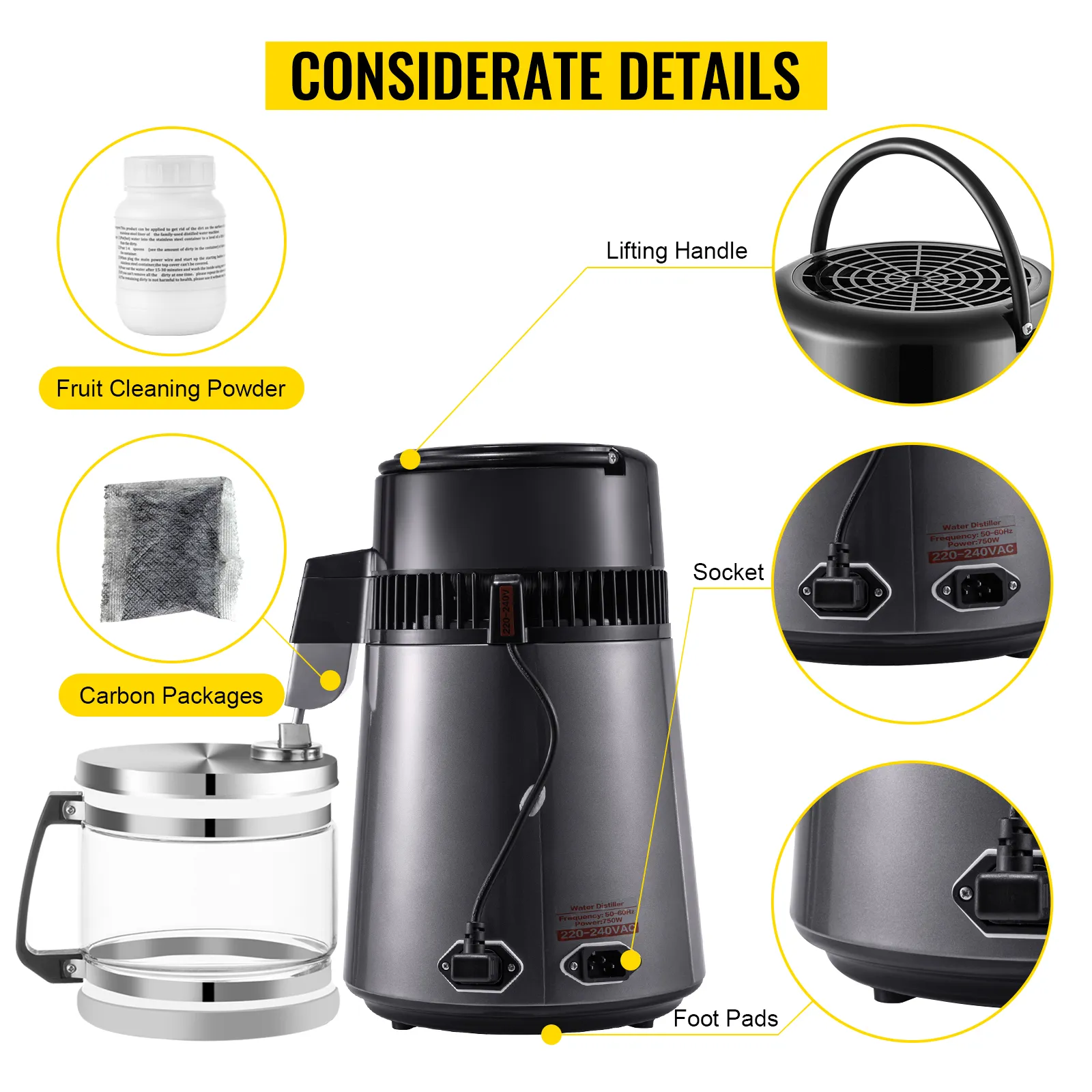 Three packs of carbon bring additional filtration of distilled water. A bottle of fruit cleaning powder is also available to dissolve the limescale attached to the inner tank.
