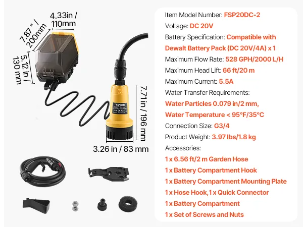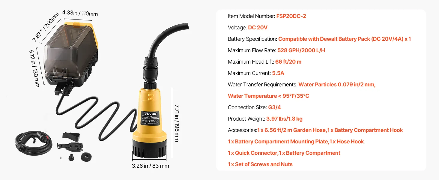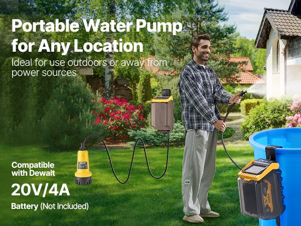 Draagbare waterpomp: Deze snoerloze dompelwaterpomp biedt de flexibiliteit van snoerloos gebruik en is compatibel met Dewalt 20V/4A-accu's (niet inbegrepen). Of u nu thuis, op de camping of in de tuin bent, deze pomp zorgt altijd en overal voor een handige watervoorziening - geen stopcontact nodig