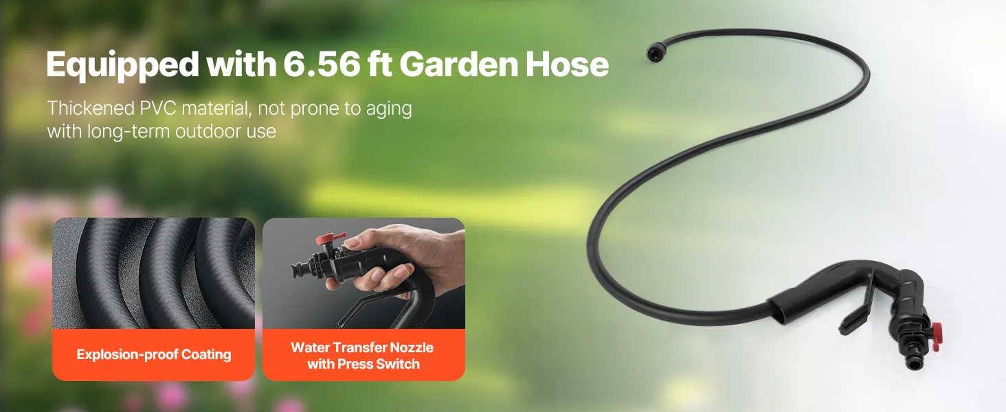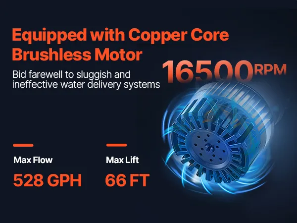 Met een debiet van 528 GPH en een opvoerhoogte van 20 m is het ideaal voor de meeste wateroverdrachtstaken. Dankzij de borstelloze motor met een toerental van 16.500 tpm en een tuinslang van G3/4 inch kunt u de machine handsfree bedienen en automatisch water geven.