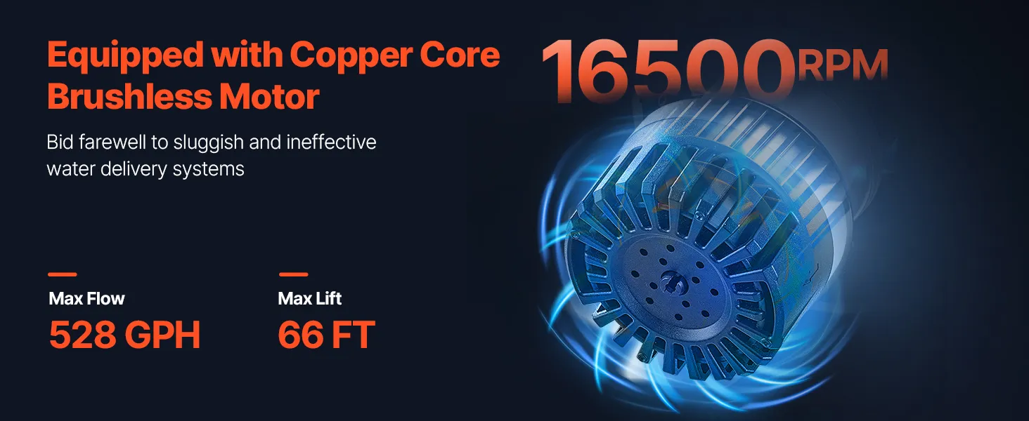 Krachtige prestaties: Deze dompelpomp is uitgerust met een borstelloze motor met koperen kern van 16.500 tpm en levert een uitzonderlijke waterverplaatsing met een maximale stroomsnelheid van 528 GPH en een maximale opvoerhoogte van 66 voet. Onze pomp is geschikt voor taken zoals het leegpompen van zwembaden of het besproeien van tuinen en kan dit allemaal met gemak aan