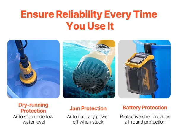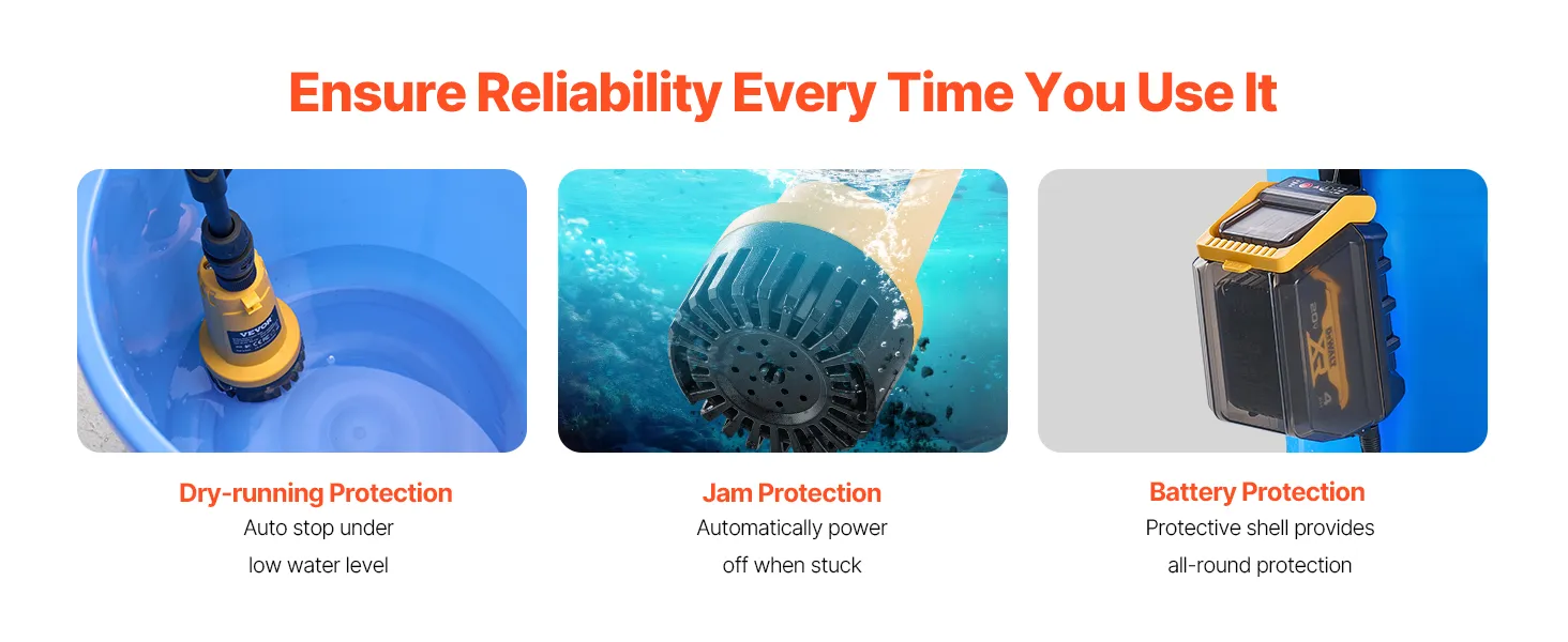 Een droogloopbeveiliging zorgt ervoor dat de batterijgevoede pomp automatisch stopt als het waterpeil laag is. Een verstoppingsbeveiliging beschermt tegen schade door overbelasting of verstoppingen. De waterdichte batterijbehuizing zorgt voor een soepele werking, zelfs bij zware weersomstandigheden.