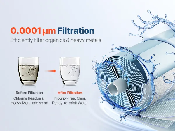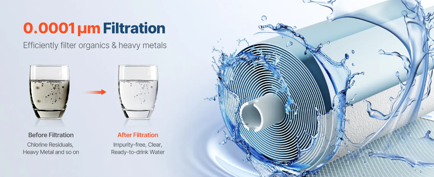 Premium Materials: Equipped with an advanced 0.0001 μm RO membrane, our tankless reverse osmosis system captures particles beyond the reach of standard water filters.