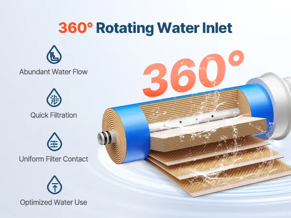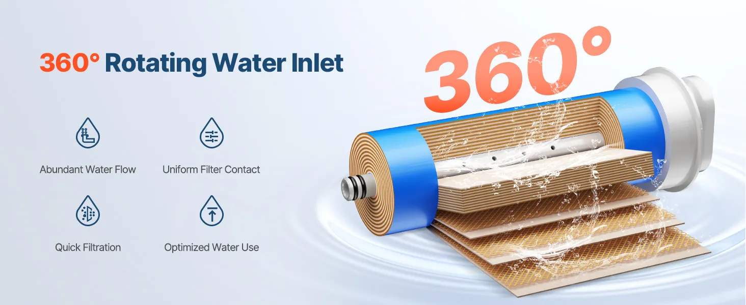 Innovative Multi-layer Filtration: Our tankless RO system under sink has advanced RO membrane technology with a 360° rotating water inlet, ensuring thorough impurity reduction for cleaner, fresher water.