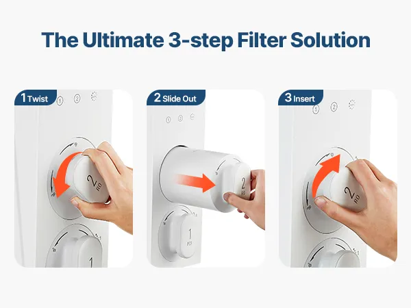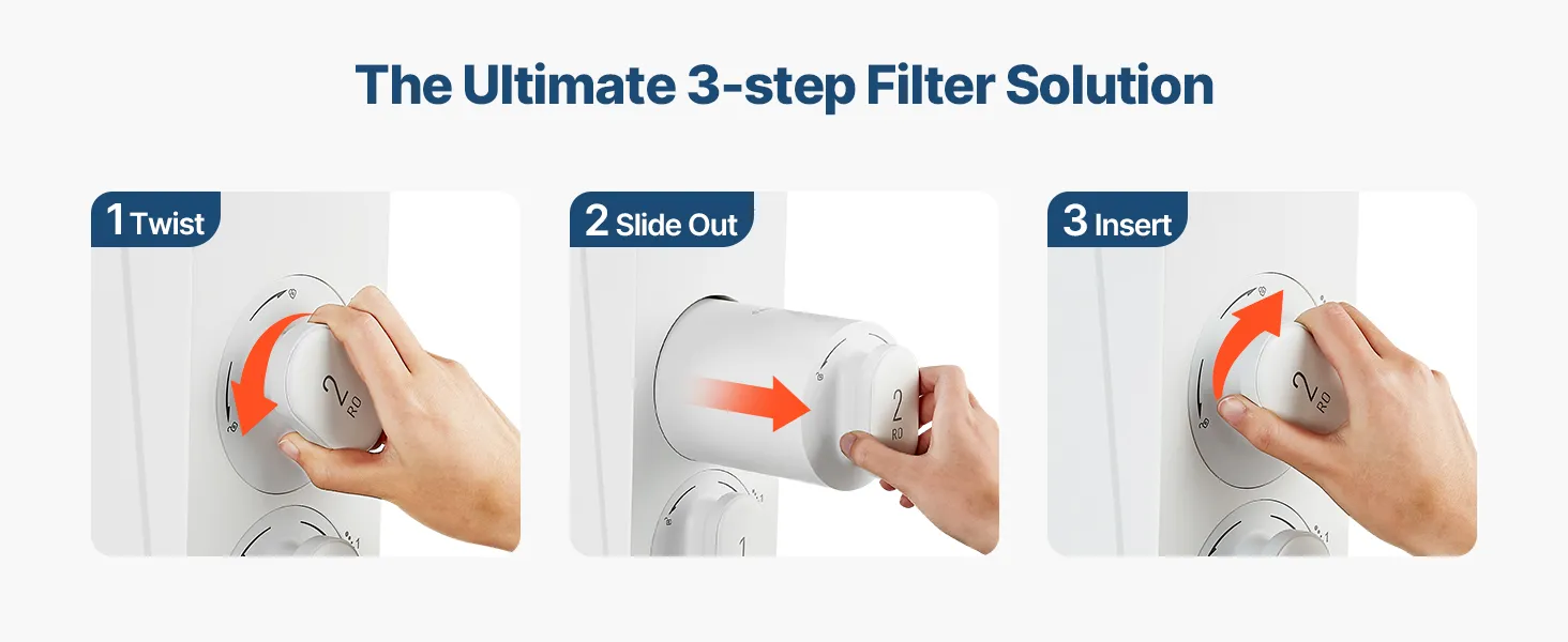 A simple twist and pull is all it takes! Replace the filter of our tankless RO system under sink effortlessly without tools or moving the unit. Enjoy hassle-free filter changes in seconds.