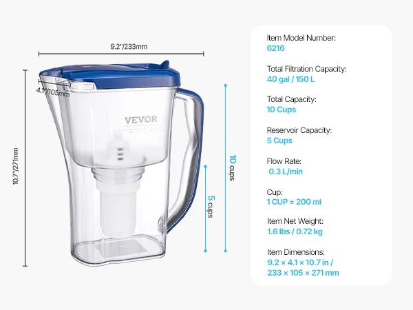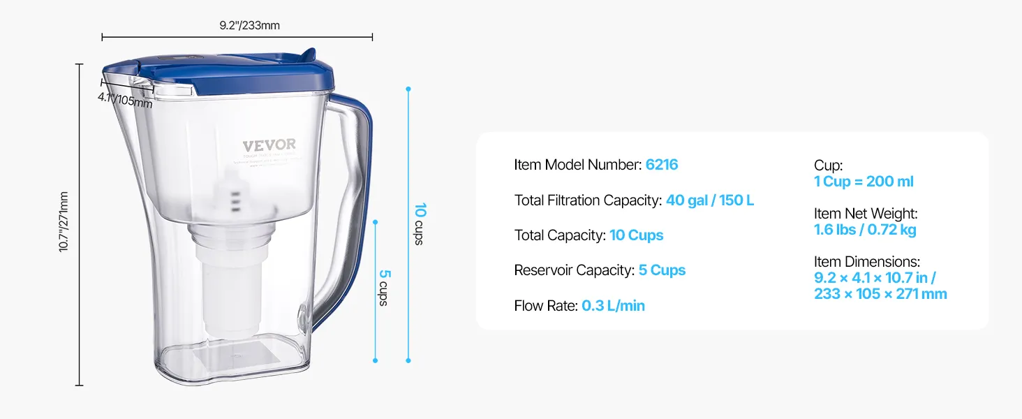 Enjoy clean, fresh water with our water filter pitcher. It reduces heavy metals, chlorine, and odors while keeping essential minerals. Its fridge-friendly design ensures cold water anytime. One filter lasts 40 gallons, saving you 302 bottles. Plus, the timer reminds you when to replace the filter.