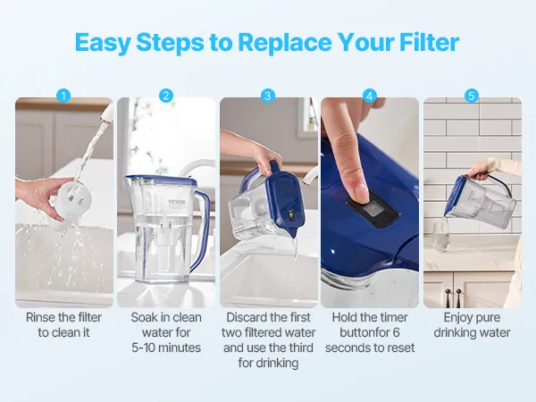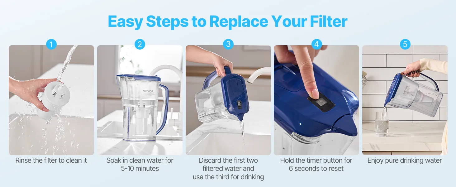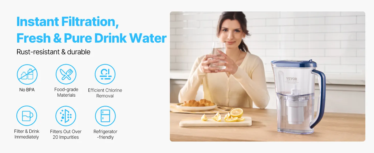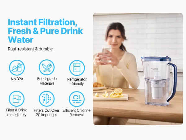 Our water pitcher with filter lets you switch filters in seconds and enjoy fresh water for all your needs, like drinking, cooking, or skincare. Note: Soak the filter for 5-10 minutes before first use, and discard the first two batches of filtered water.