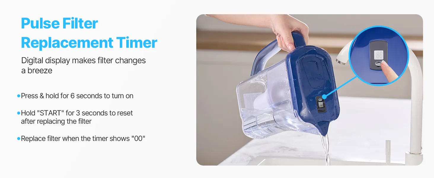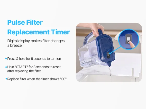 Filter Replacement Reminder: Our water filter pitcher for fridge is equipped with a built-in timer, ensuring you never forget to change your filter on time