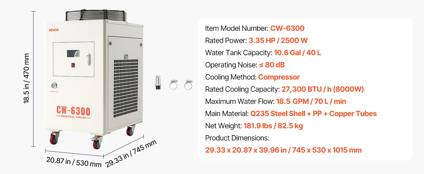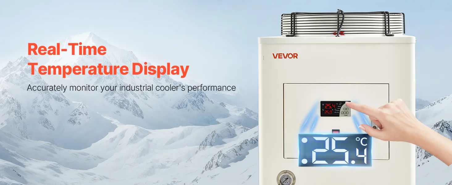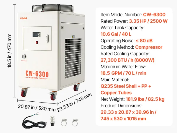 VEVOR Industrial Water Chiller, 27,300 BTU/h, Industrial Water Cooler Cooling System with Compressor, 10.6 Gal Tank Capacity, 18.5 GPM Max Flow Rate, for CO2 Laser Tube Engraving & Cutting Machine