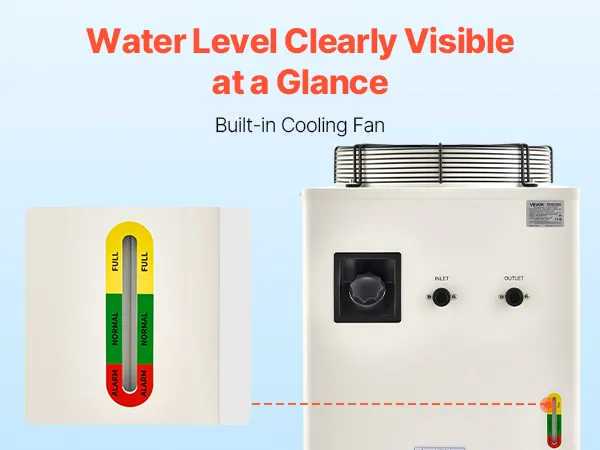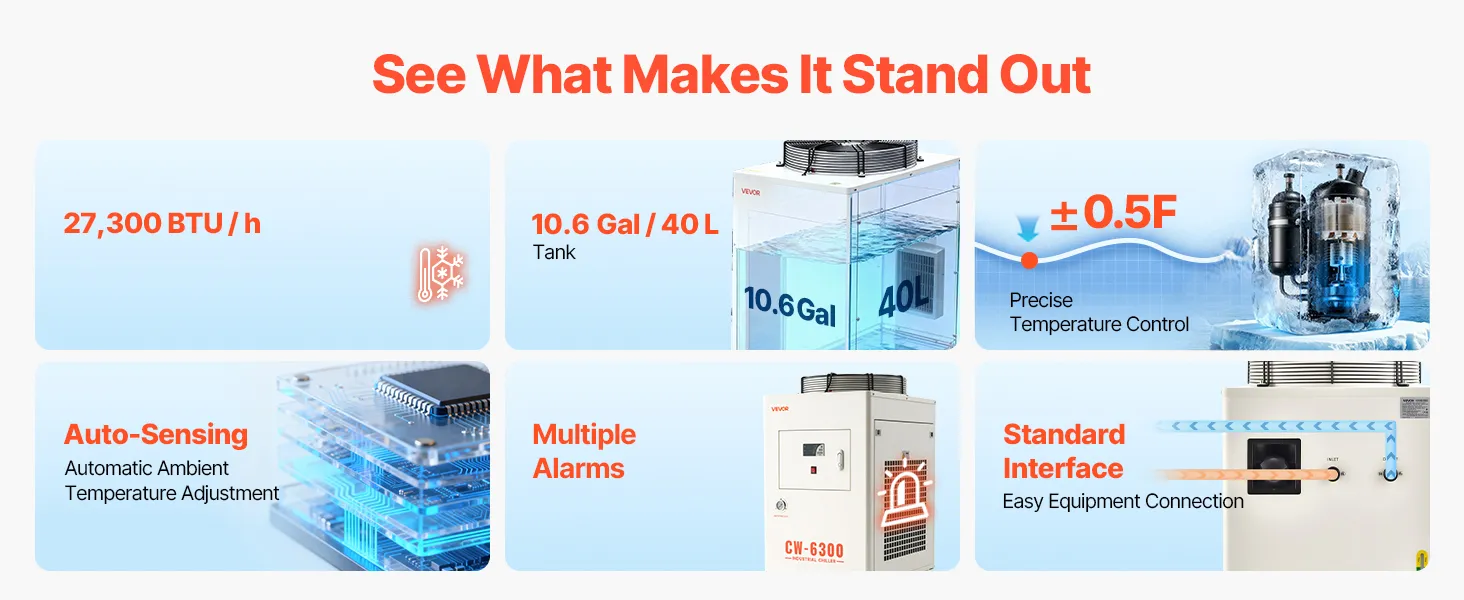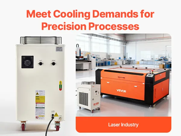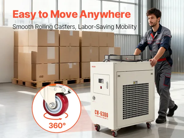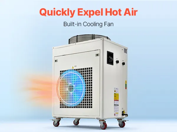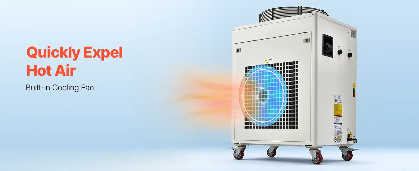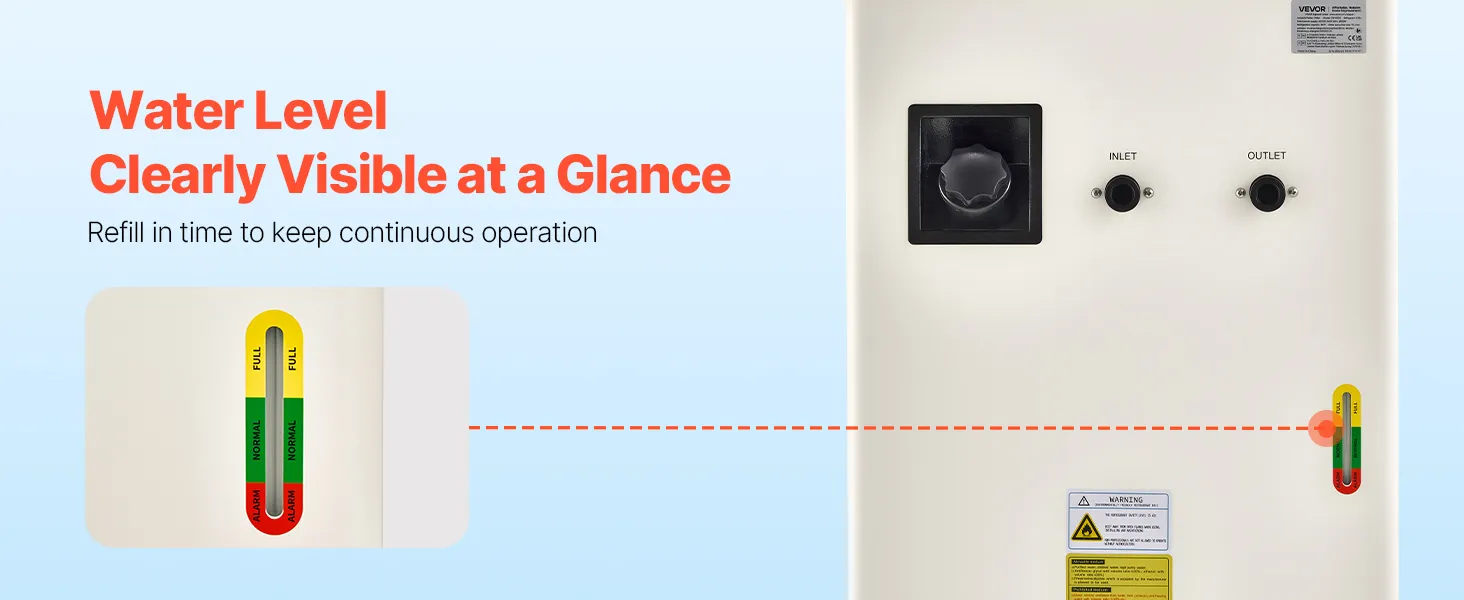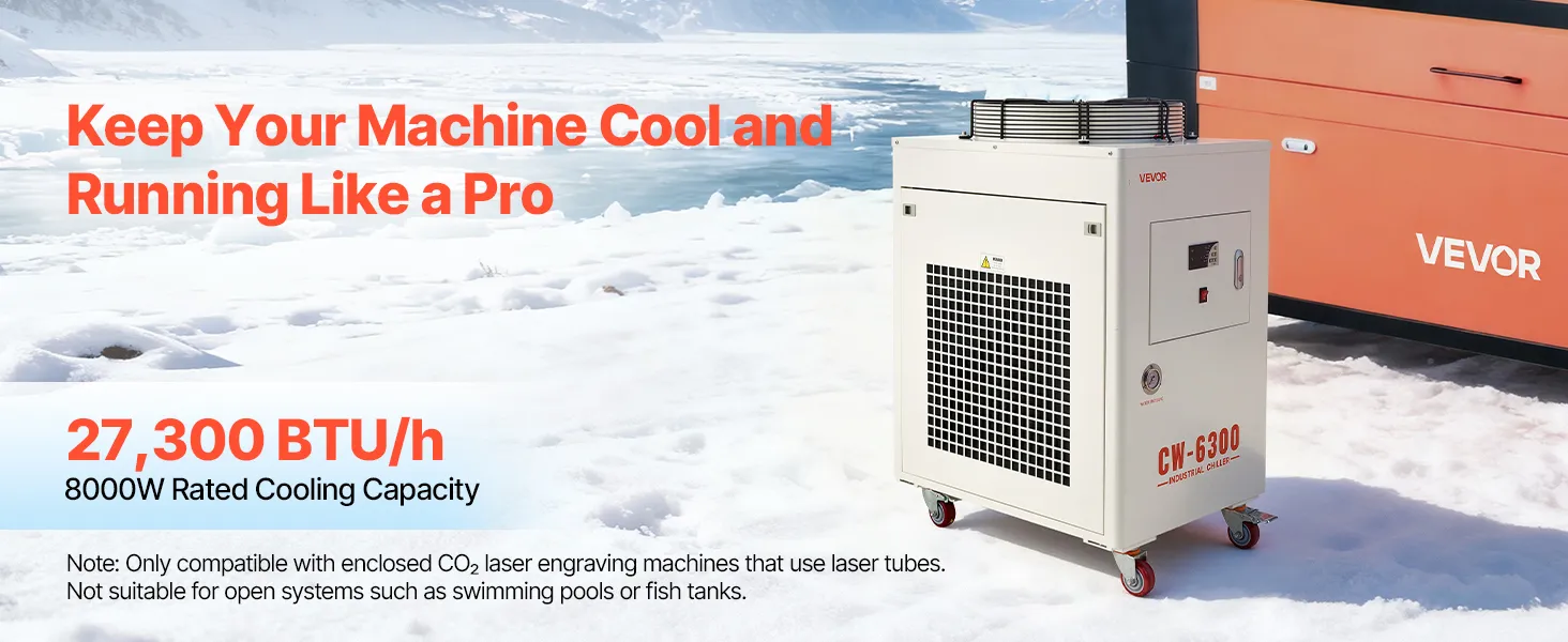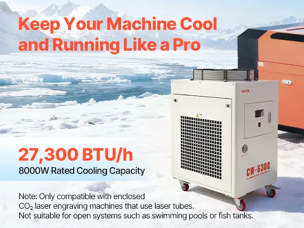 27,300 BTU/h Cooling Capacity: This industrial water chiller features a powerful compressor to rapidly dissipate heat. Designed for one 600W or two 300W laser tubes, it keeps your laser engravers running more stably compared to air-cooled chillers