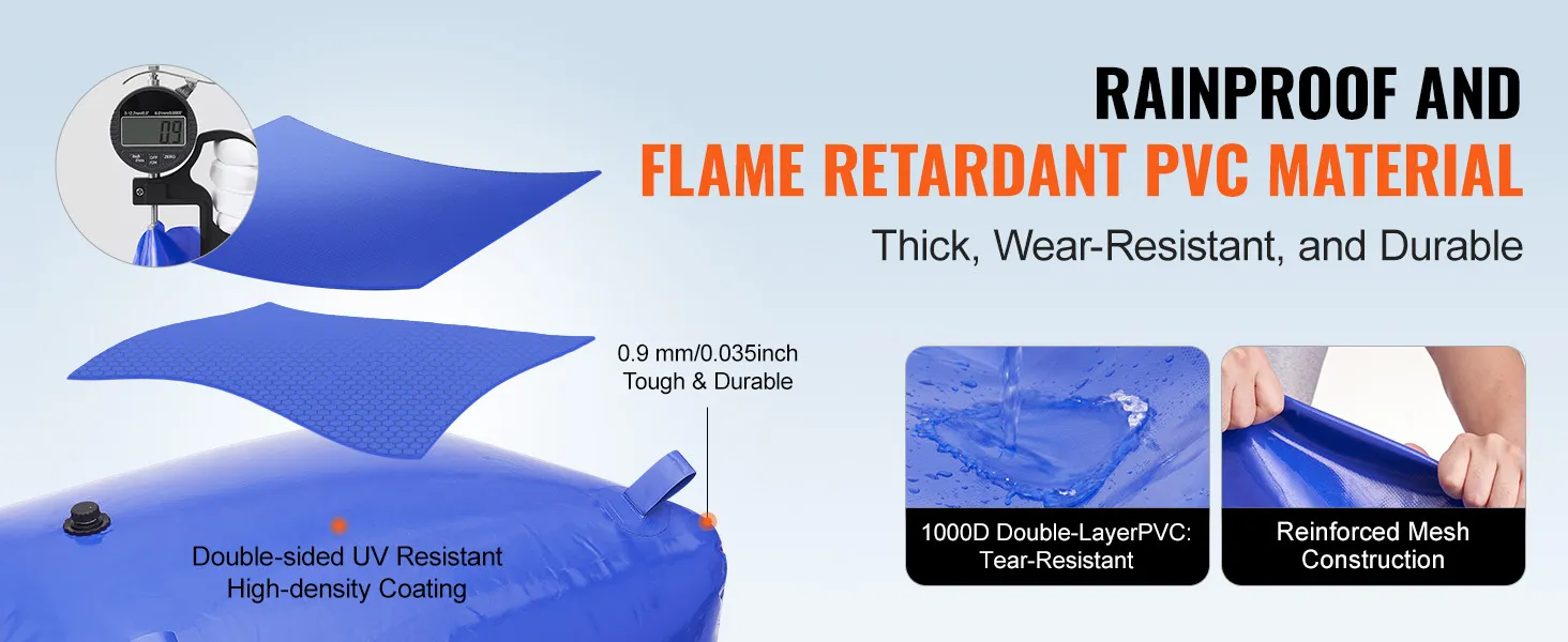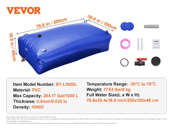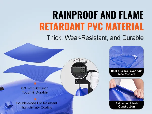Robuust PVC, dik en sterk, zorgt voor duurzaamheid in de constructie van de VEVOR 1000L wateropslagblaas. De blaas is bestand tegen slijtage. Hij gaat lang mee. Ook is het materiaal bestand tegen perforaties en scheuren. Dus hij is betrouwbaar voor langdurig gebruik. Onze blaas kan tot 264 gallons bevatten en is bestand tegen perforaties en lekken. Dat betekent dat u er jarenlang op kunt rekenen. Welke materialen zijn er gebruikt voor deze unit? Het hoogwaardige materiaal dat wordt gebruikt voor deze blaas zorgt ervoor dat hij u vele jaren van dienst zal zijn. Het is een geweldige investering voor iedereen die op zoek is naar een betaalbare oplossing voor wateropslag.