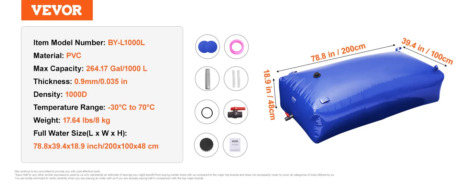 Deze 1000L wateropslagblaas slaat veel water op, tot wel 264 gallons. Dit maakt het een betrouwbare bron van noodwater. U kunt het op een veilige plek bewaren en gebruiken wanneer nodig. De blaas is gemaakt van duurzaam PVC-materiaal. Het is sterk genoeg om zware omstandigheden aan te kunnen, zoals drinken, schoonmaken en toiletten doorspoelen. Dit gereedschap is dus perfect voor noodgevallen. Deze wateropslagblaas zou uw go-to moeten zijn voor rampenvoorbereiding. Wanneer u hem het hardst nodig hebt, is het cruciaal om er zelf een te hebben.