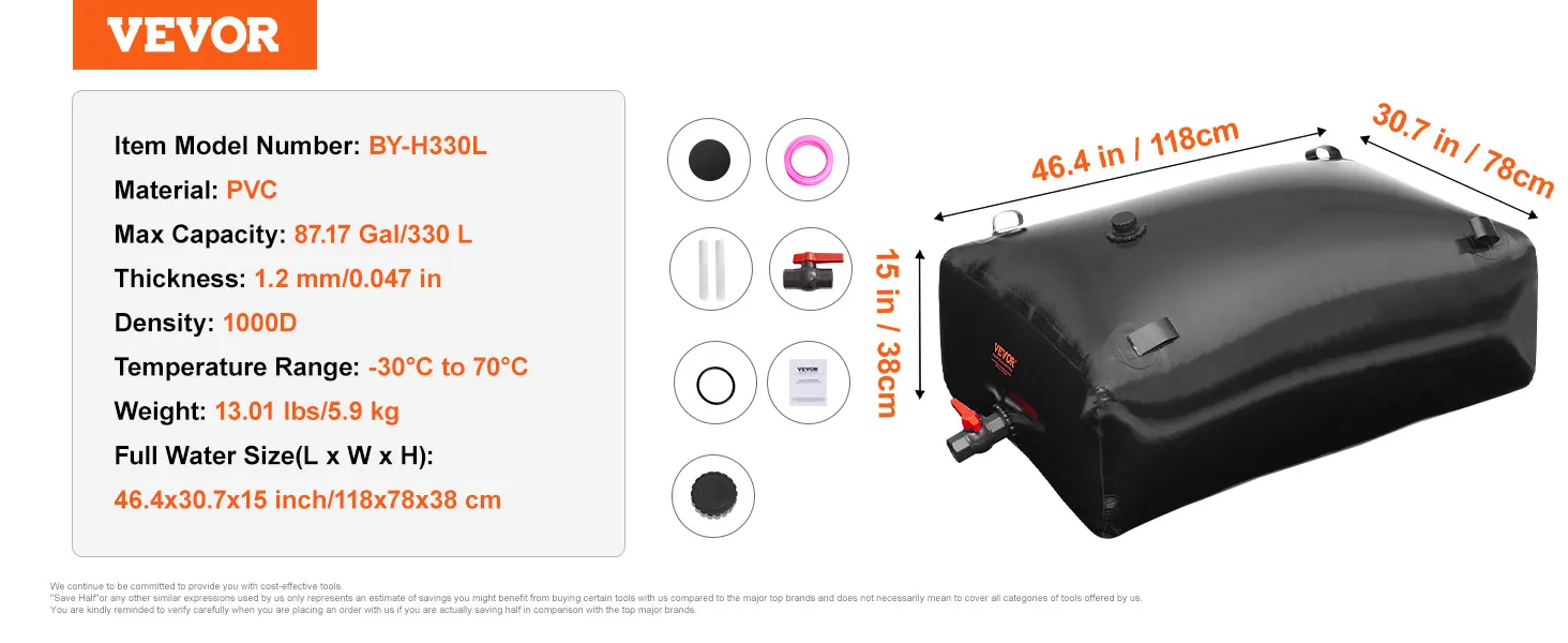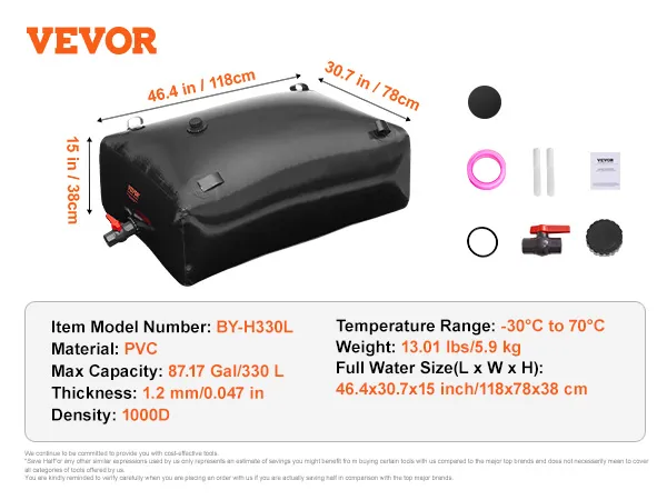 VEVOR 330L/87.17 Gallon Water Storage Bladder, RV Water Tank, 1000D PVC Collapsible Water Storage Containers, Large Capacity Soft Water Bag, Portable Water Bladder, Fire Prevention, Camping, Emergency