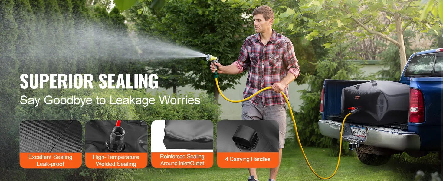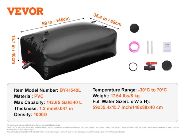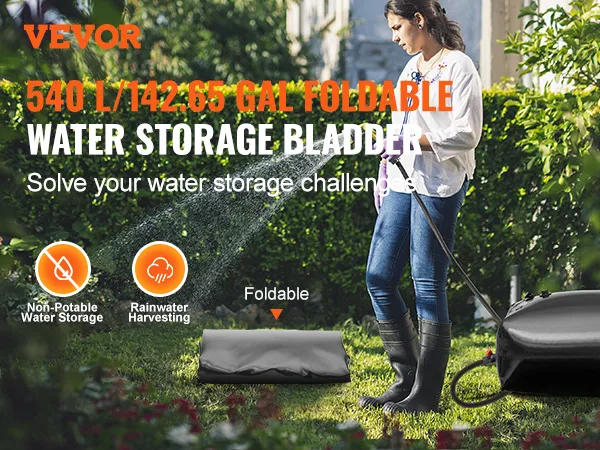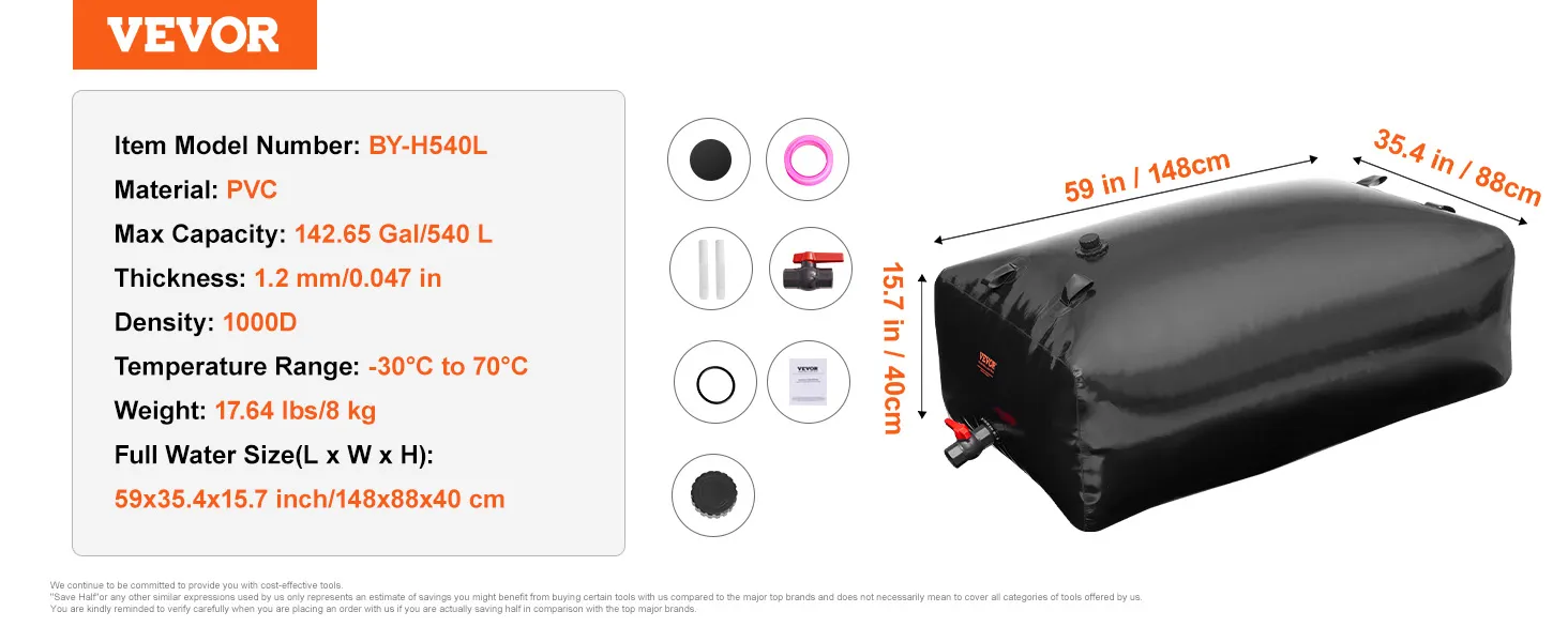 142,65 gallons / 540 l Grote capaciteit: de extra grote wateropslagcapaciteit betekent dat u niet vaak hoeft bij te vullen en aan uw hoge dagelijkse waterbehoeften kunt voldoen. Of het nu gaat om de noodvoorziening van huishoudelijk water, langere kampeertochten of het continu besproeien van de tuin, deze watertank is uw onmisbare hulp.