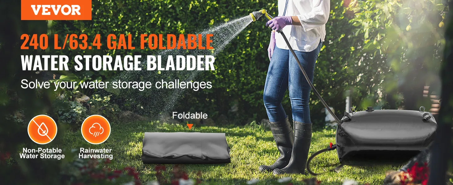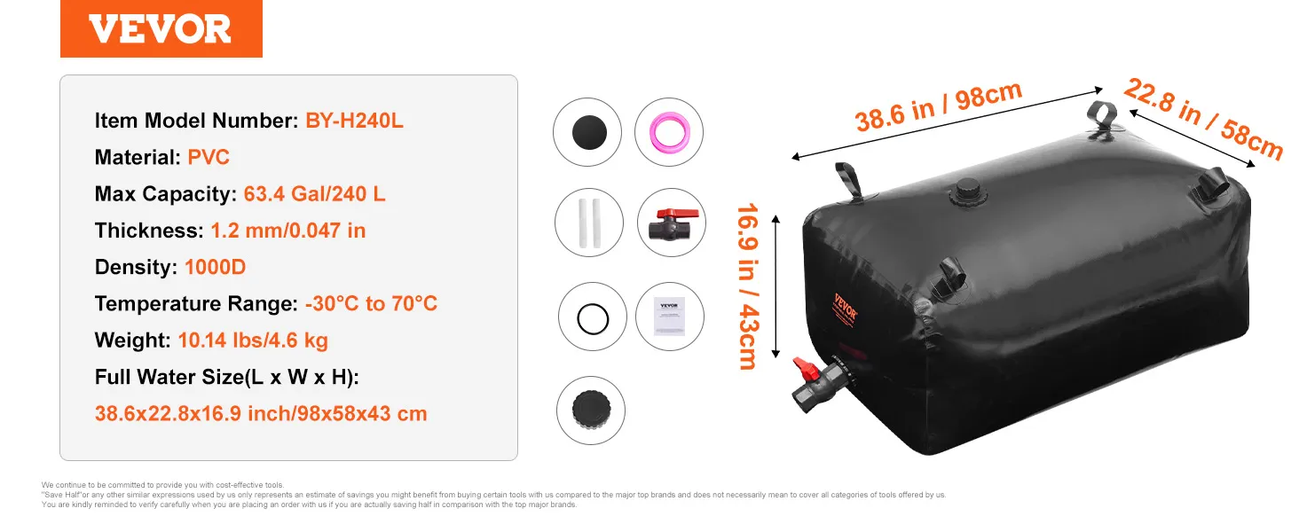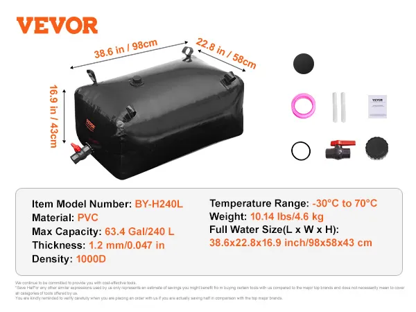 VEVOR 240L/63.4 Gallon Water Storage Bladder, Portable RV Water Tank, 1000D PVC Collapsible Water Storage Containers, Soft Water Storage Bag, Water Bladder, Fire Prevention, Camping, Emergency Water