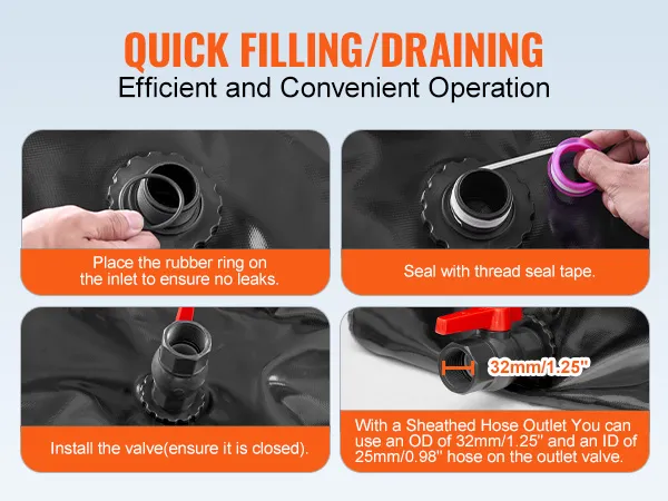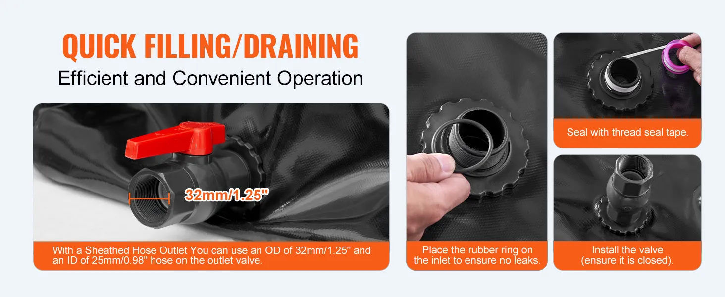 Convenient and Efficient: To enhance your experience, this portable water tank is designed with a hose sleeve outlet. It is compatible with hoses with an O.D. of 32mm/1.25" and an I.D. of 25mm/0.98", requiring no professional tools for installation, making the water storage process easy and efficient.