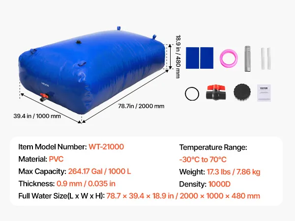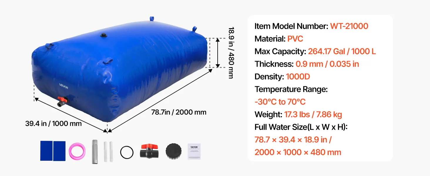 Deze opvouwbare waterzak van VEVOR (1000 liter) is gemaakt van stevig 1000D dubbellaags PVC voor maximale duurzaamheid. De sterke afdichting en lekvrije constructie zorgen voor betrouwbare wateropslag voor buitenavonturen, thuisgebruik, tuinieren of noodgevallen.