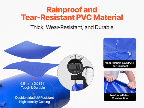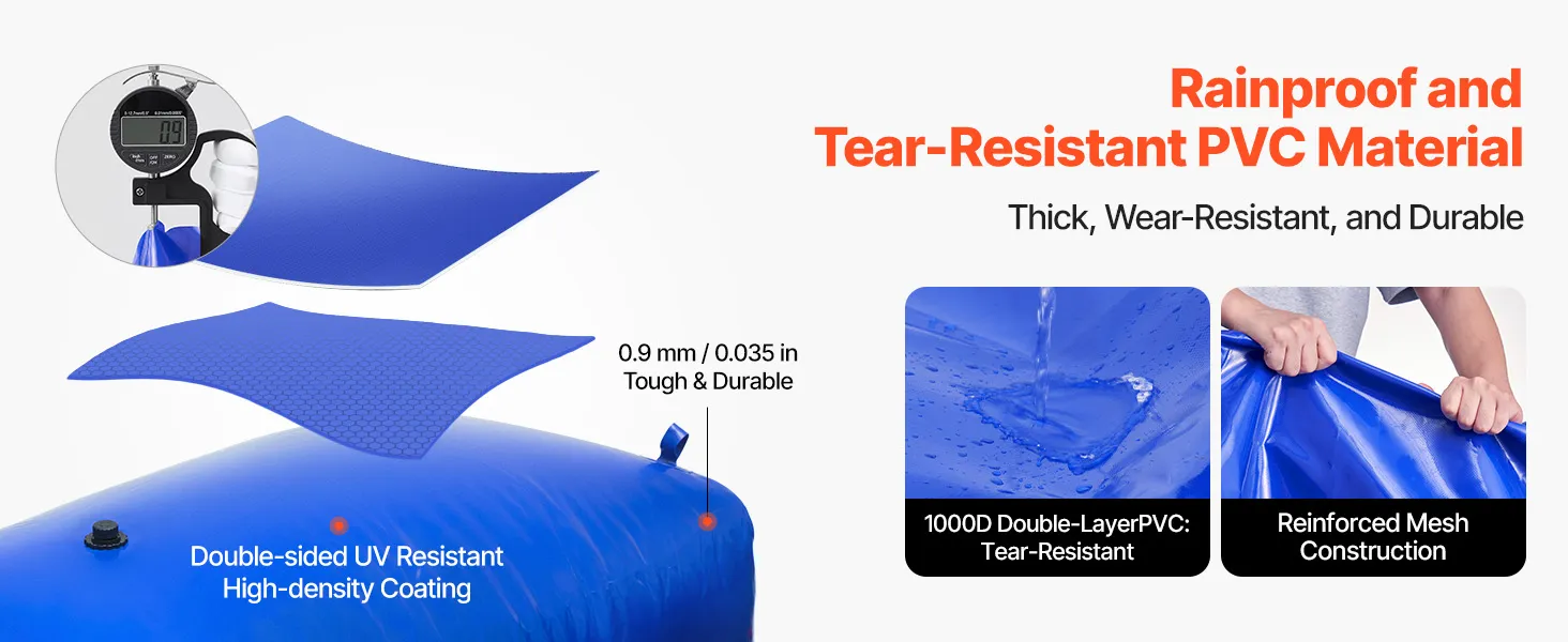 Deze wateropslagtank is gemaakt van duurzaam 1000D dubbellaags PVC en is regenbestendig, brandvertragend, slijtvast en eenvoudig te vormen. Hierdoor is de tank ideaal voor dagelijks thuisgebruik, buitenactiviteiten, kamperen en landbouwirrigatie.