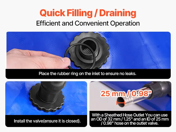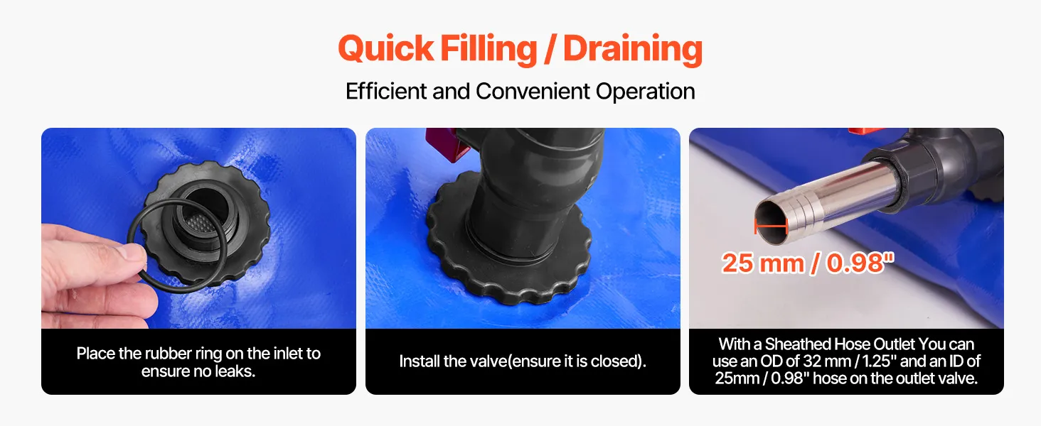 Efficiënte wateropslag: Deze opvouwbare, draagbare watertank heeft grote in- en uitlaatpoorten – met een inlaatdiameter van 38 mm (1,5 inch) buitendiameter en 32 mm binnendiameter, en een uitlaatdiameter van 32 mm (1,25 inch) buitendiameter en 25 mm binnendiameter. Hij kan eenvoudig worden aangesloten op een slang voor snelle wateropslag.