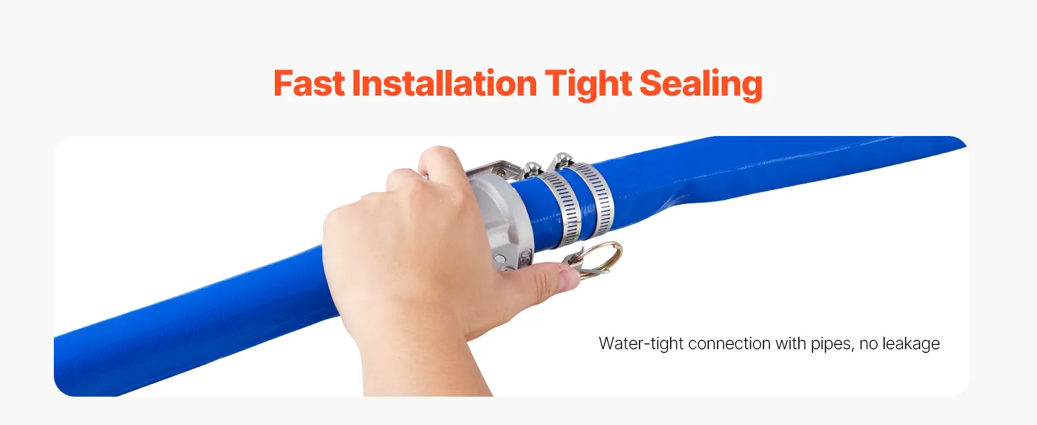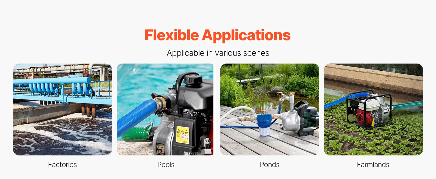 Brede toepassing: de slangenset is geschikt voor een verscheidenheid aan pompen en kan snel worden aangepast aan pompen die in verschillende scenario's op de markt worden gebruikt. De slangenset is geschikt voor fabrieken, landbouwgronden, zwembaden, bouwplaatsen en andere scenario's voor waterafvoer, rioolwaterafvoer, irrigatie en het verpompen van water met een verscheidenheid aan vloeibare en vaste materialen.