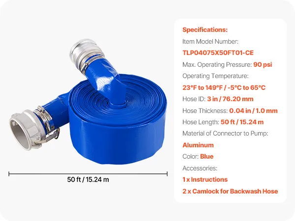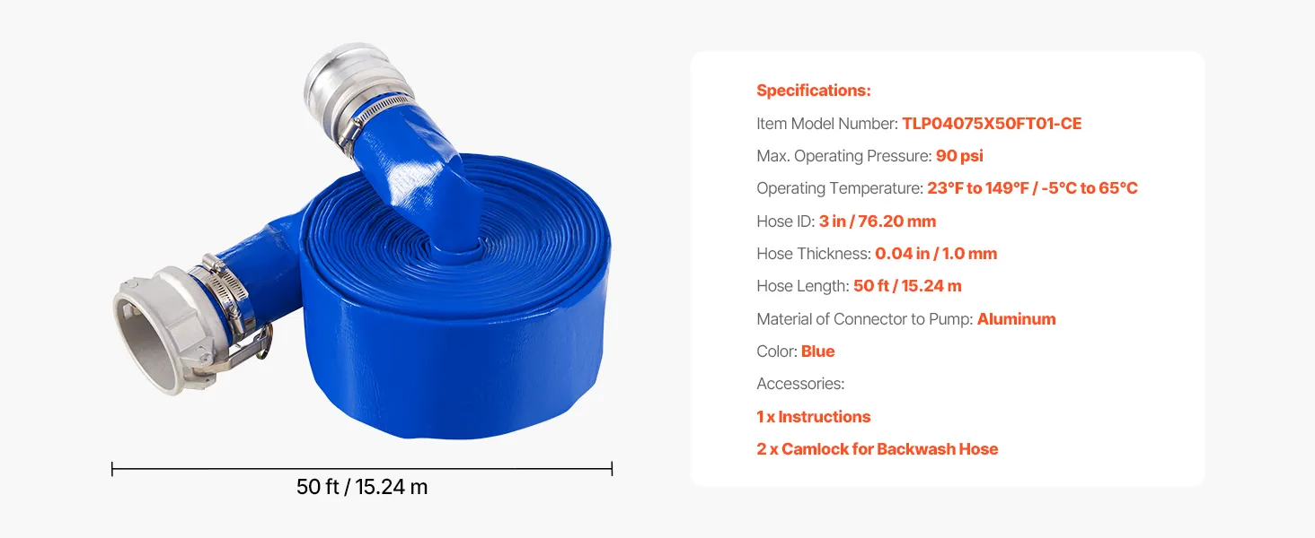 VEVOR Backwash Hose, 3 in x 50 ft, Blue High Quality PVC Hose, with Clamps, Camlock, Aluminum Fittings, Fit Various Pumps, for Sewage Treatment, Water Transportation and More Agricultural Purposes