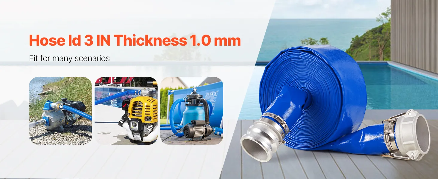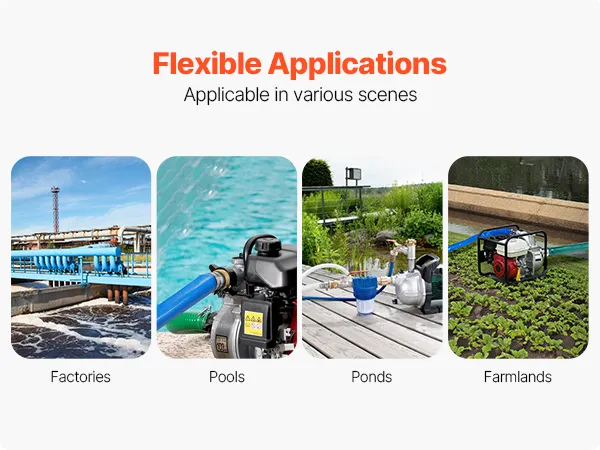 Wide Application: The hose kit is applicable to a variety of pumps, and can be quickly adapted to and work with pumps used in different scenarios on the market. The hose kit is applicable to factories, farmlands, pools, construction sites and other scenarios, for water drainage, sewage discharge, irrigation, water pumping with a variety of liquid and solid materials.
