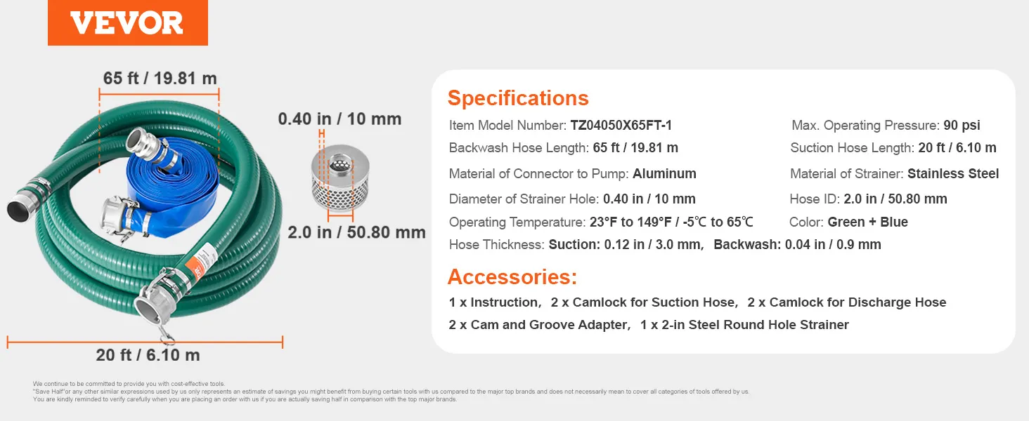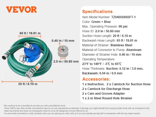 VEVOR zuigslangset, met 50,8 mm x 19,81 m blauwe terugspoelslang, 6,1 m groene zuigslang en stalen zeef met rond gat, camlocks, klemmen, cam- en groefadapter, voor diverse doeleinden