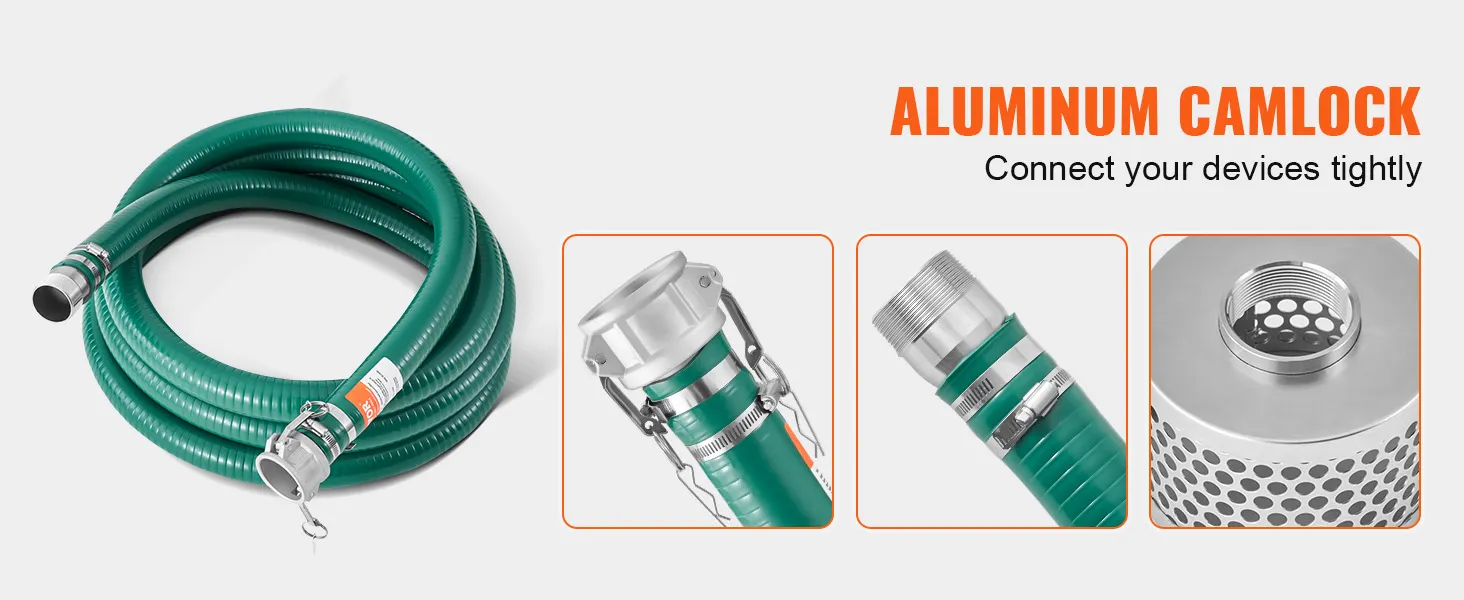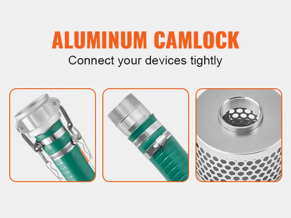 De aluminium camlock-aansluitingen van de zuigslang zijn betrouwbaar en bestand tegen hoge waterdruk zonder te barsten of te lekken.