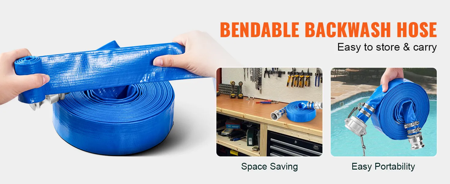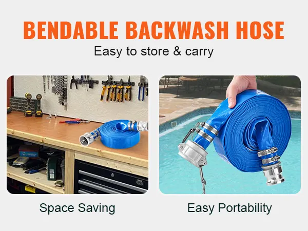 Hoogwaardige terugspoelslang: de terugspoelslang is uitgerust met mannelijke en vrouwelijke aansluitingen op de pomp, wat zorgt voor een goede afdichting en een sterke en duurzame lekbescherming. De slang is gemaakt van PVC-materiaal met een hoge dichtheid met meerlaagse vlecht om treksterkte te garanderen en kan plat worden opgerold voor eenvoudige opslag en gemakkelijk transport. Zelfs bij lage temperaturen behoudt de slang zijn flexibiliteit.