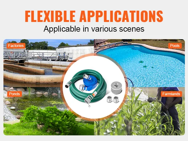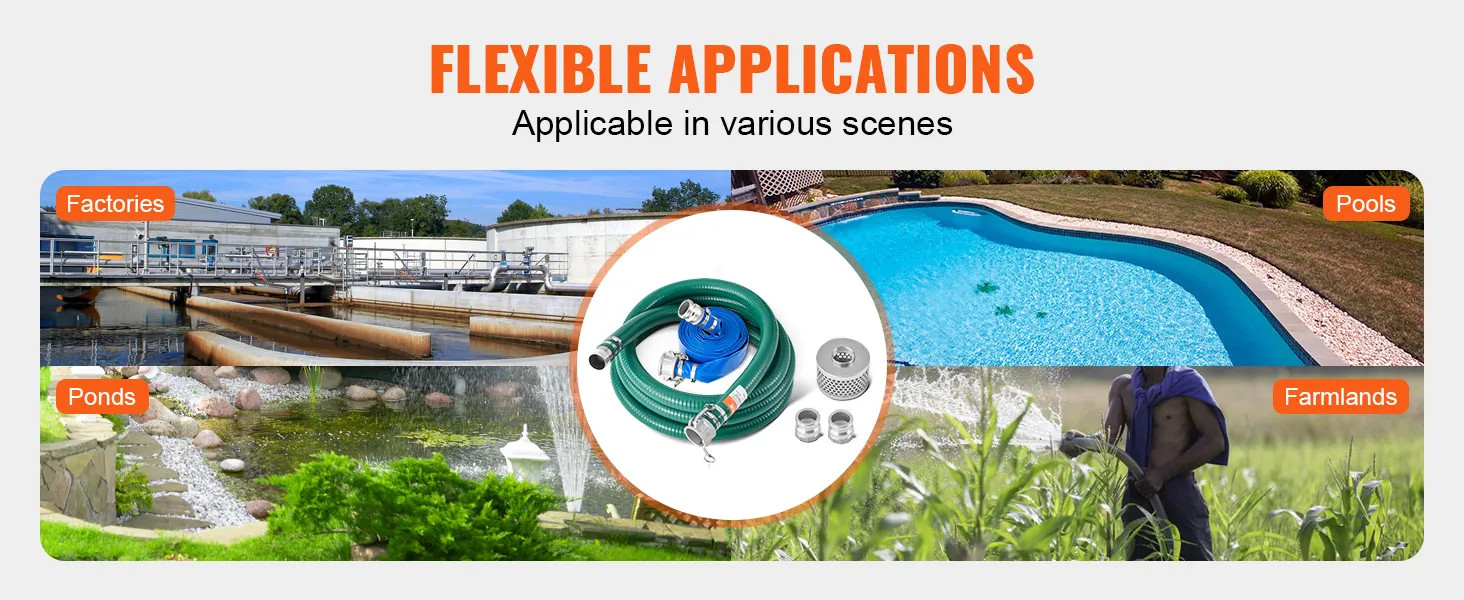 Brede toepassing: de slangenset is geschikt voor een verscheidenheid aan pompen en kan snel worden aangepast aan pompen die in verschillende scenario's op de markt worden gebruikt. De slangenset is geschikt voor fabrieken, landbouwgronden, zwembaden, bouwplaatsen en andere scenario's voor waterafvoer, rioolwaterafvoer, irrigatie en het verpompen van water met een verscheidenheid aan vloeibare en vaste materialen.