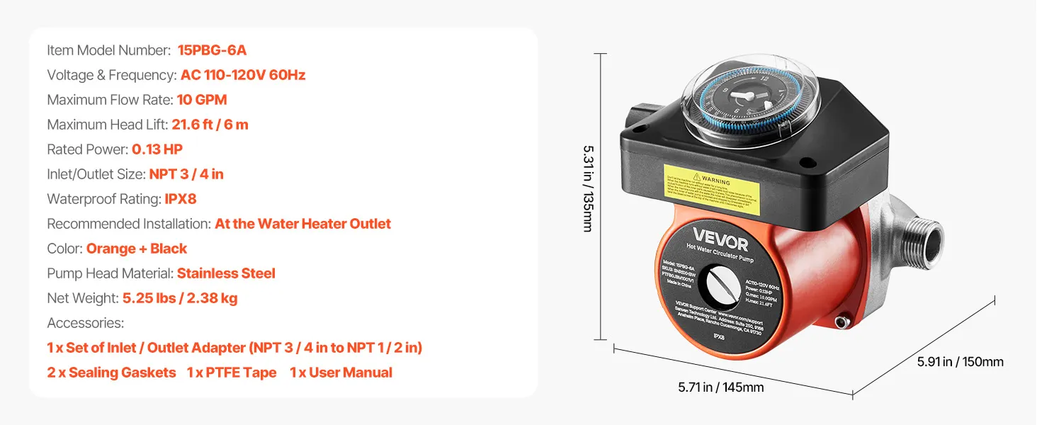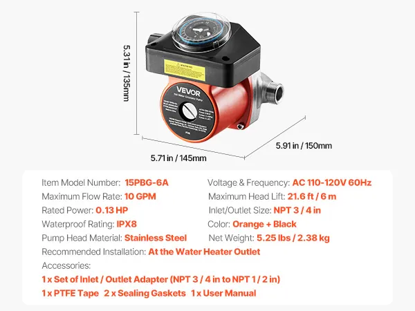VEVOR Hot Water Recirculating Pump, with Timer, 38 LPM Instant Recirculation Pump Kit, Circulation Circulator System, 100W AC 220-240V, G3/4 in to G1/2 in Connector, for Boiler Solar Water Heater VEVOR Hot Water Recirculating Pump, with Timer, 38 LPM Instant Recirculation Pump Kit, Circulation Circulator System, 100W AC 220-240V, G3/4 in to G1/2 in Connector, for Boiler Solar Water Heater