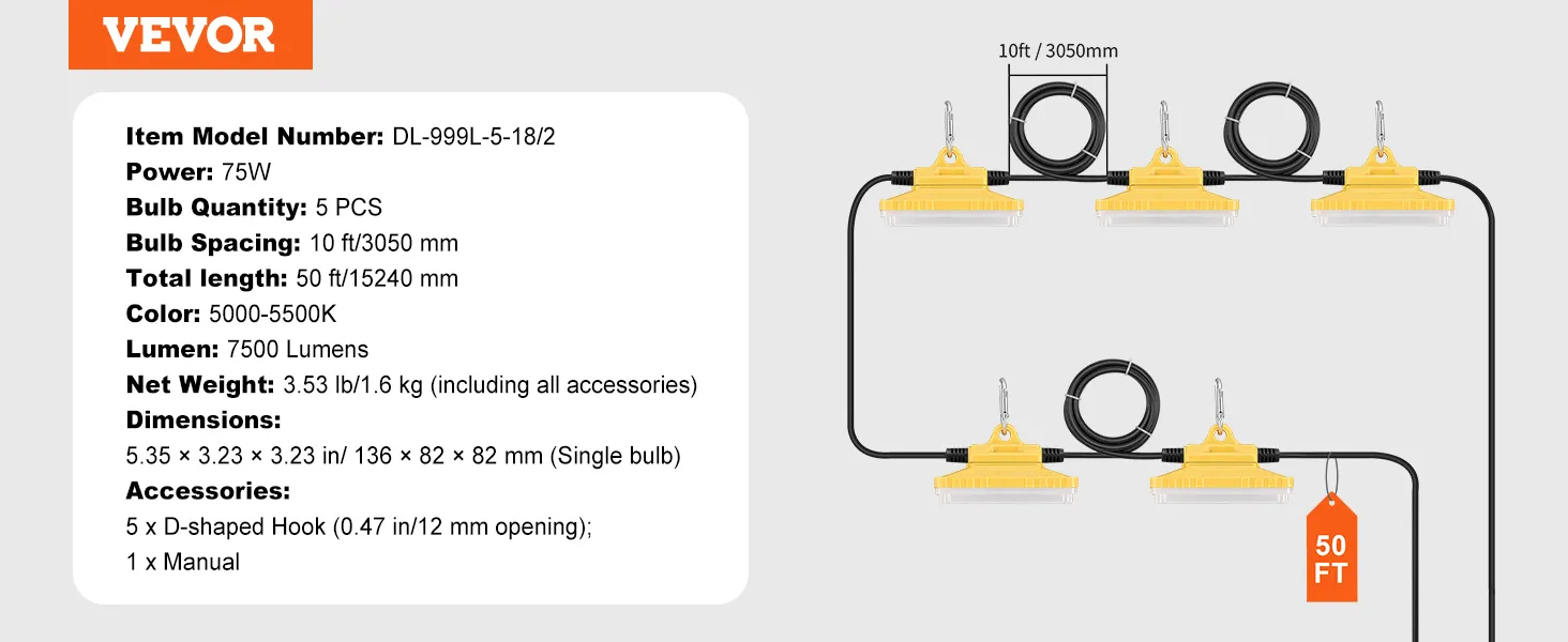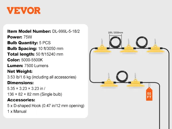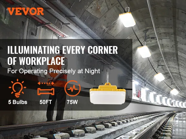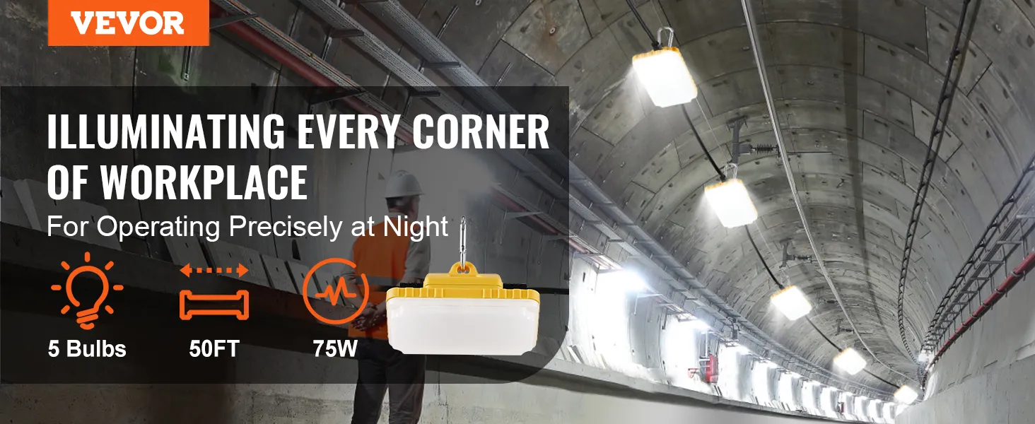 Up to 7500LM: VEVOR construction string lights meet a variety of indoor and outdoor lighting needs at night with 75w power and 50ft overall length. 5000-5500K normal daylight color temperature, presenting the true color of the illuminated object.