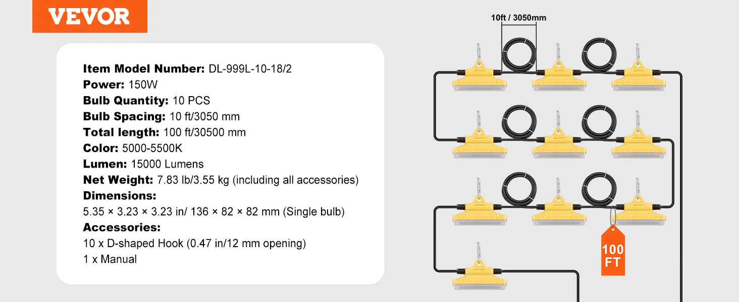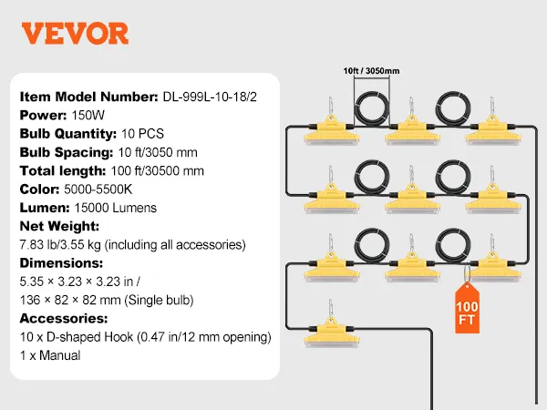 VEVOR 30,5 m bouwlamp, 150 W, 15.000 lm, 10-strengs werklamp, 5.000-5.500 K, IP65 waterdicht, met ophanghaak, voor bouwplaatsen, tijdelijke verlichting binnen en buiten