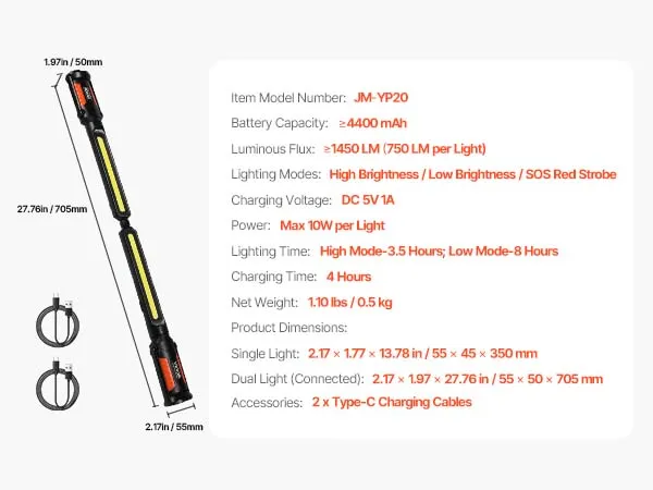 1450 LM High Brightness: This 2-in-1 underhood work light can be used independently or connected. Two 10W LED lights deliver up to 1450 lumens of bright light. With a 6000K-7000K color temperature and CRI ≥70, illuminating your workspace is a breeze. The work light bar also features two brightness levels and an SOS mode to meet all your needs.