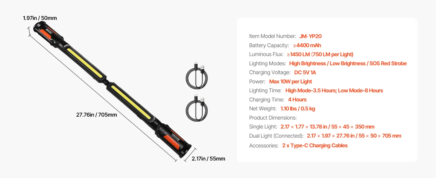 VEVOR Underhood Work Light, 1450LM, 4400mAh Rechargeable Magnetic Bright LED Light, Portable Cordless Mechanic Work Light Bar, for Car Repairing Inspection Garage Workshop Emergency Home Lighting