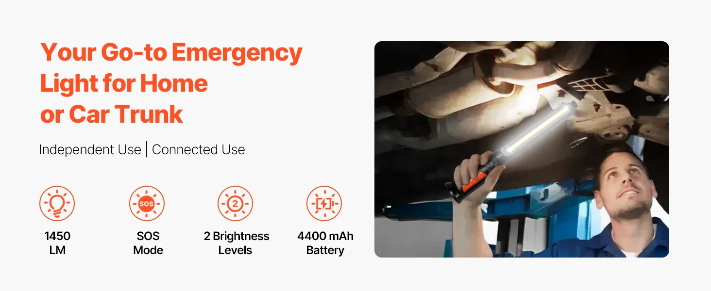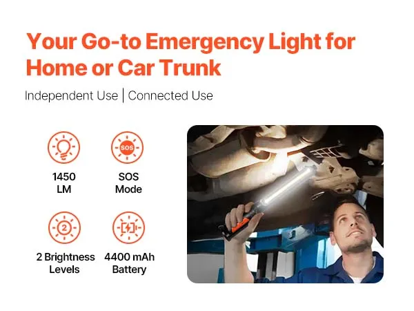 This 2-in-1 cordless work light can be used independently or connected. It delivers 1450 lumens of brightness with a 6000K-7000K color temperature, featuring two brightness levels and an SOS mode. With a 4400mAh battery, it lasts 3.5 hours on high and 8 hours on low—ideal for car repairing.