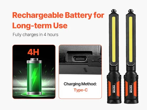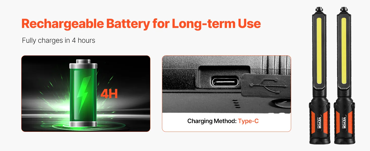 Featuring a rechargeable battery, this LED magnetic work light fully charges in just 4 hours to meet long usage needs. The Type-C charging interface ensures strong compatibility for easy charging anywhere.