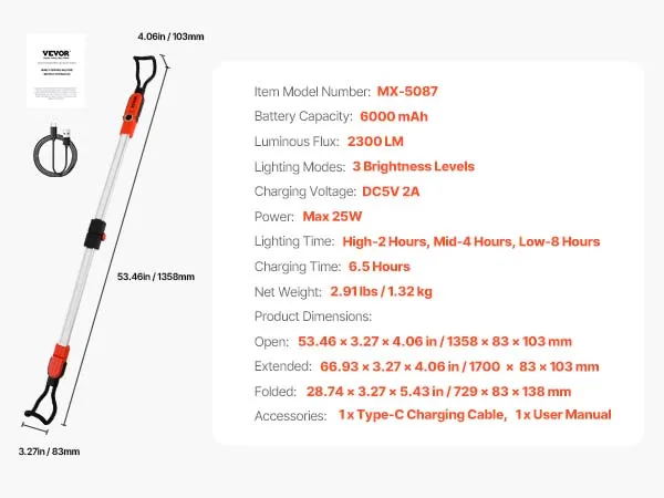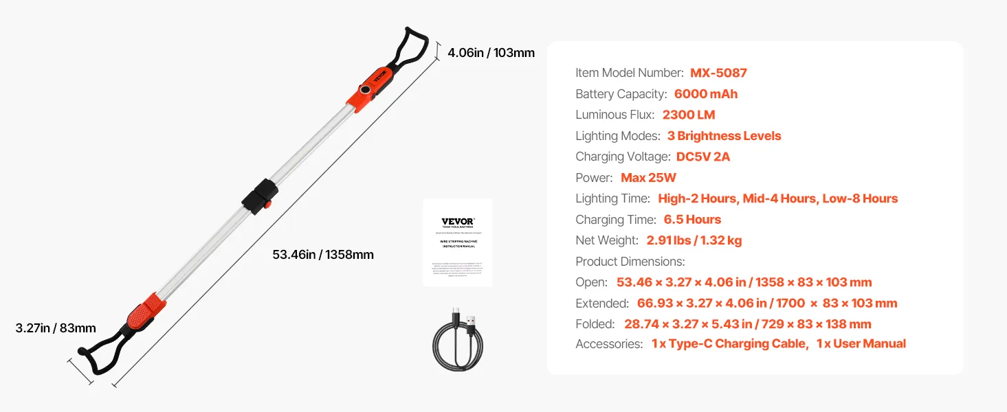 This retractable and foldable work light bar offers 2300 lumens, with a coverage of 51-74 inches, great for SUVs and trucks. The 25W LED has three brightness levels. With a 6000mAh battery and Type-C charging, it lasts 2 hours on high, 4 hours on medium, and 8 hours on low—ideal for car repairing.