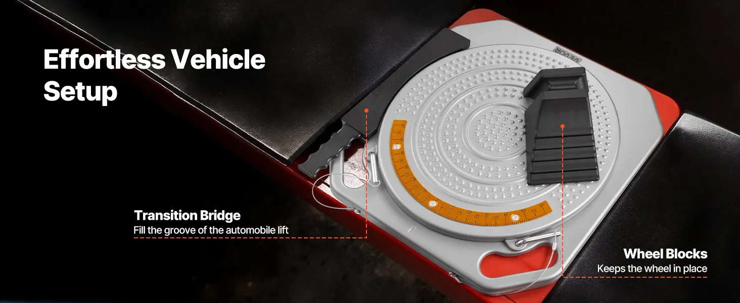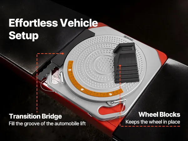 Soepele wielrotatie: Twee draaischijven voor wieluitlijning zorgen voor een wrijvingsarme, gelijkmatige wielrotatie voor nauwkeurige meting en afstelling van sporing en camber. De set bevat ook twee oprijplaten voor gemakkelijke toegang en twee wielblokken.