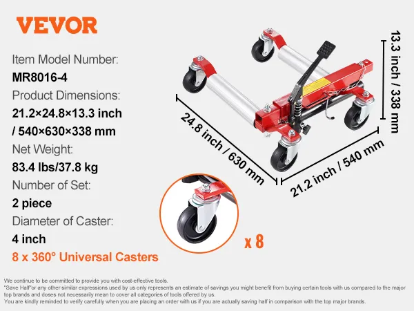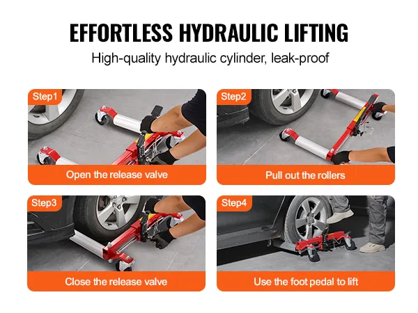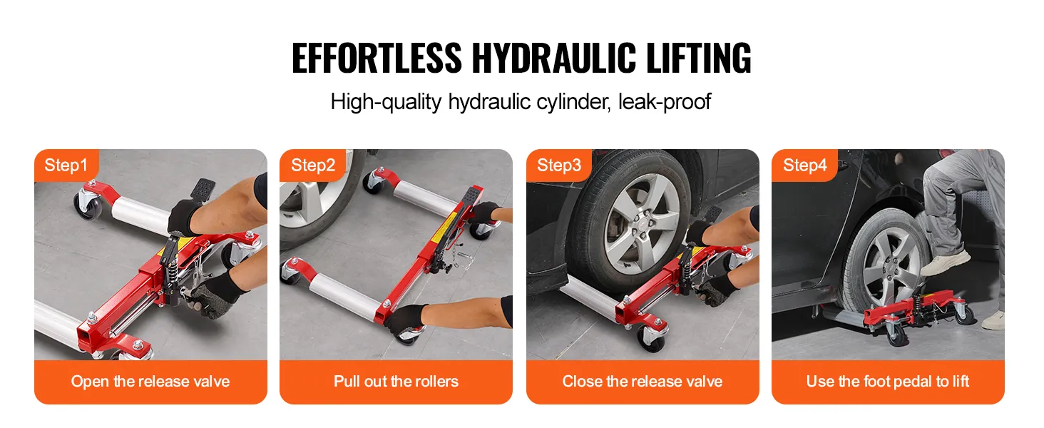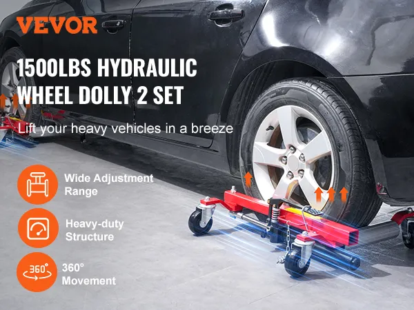 Verbeterd laadvermogen: deze hydraulische wielkrik (2 sets) tilt gemakkelijk voertuigen op met een gewicht tot 680 kg (elke wielkrik). Dankzij het robuuste laadvermogen is hij geschikt voor auto's, SUV's, caravans, grote SUV's, pick-ups, ATV's, tractoren en meer. Het maakt het verplaatsen, onderhouden en verwisselen van banden eenvoudiger in krappe ruimtes.