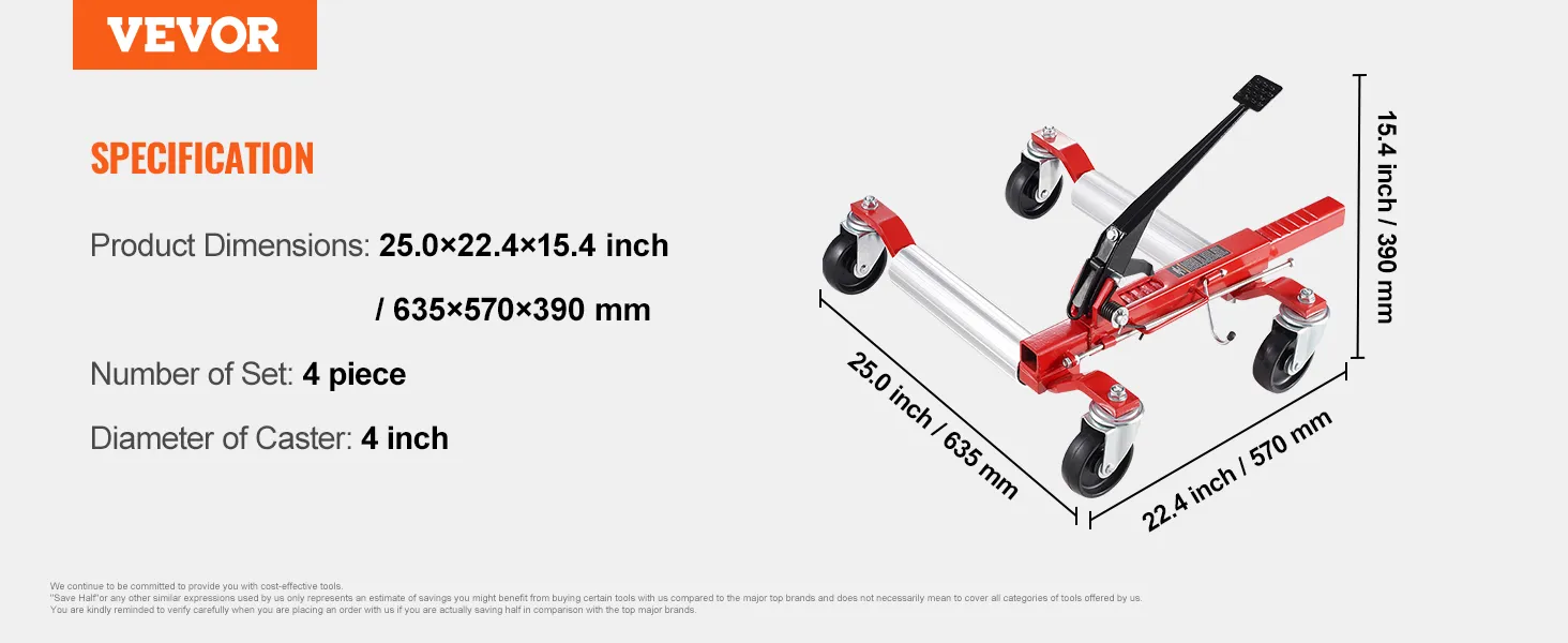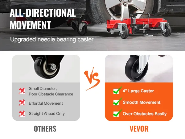 Our wheel jacks for cars features 4-inch universal casters for easy vehicle movement in any direction. Reduce labor and prevent unwanted movement. Secure your desired position with a simple press of the foot brake.