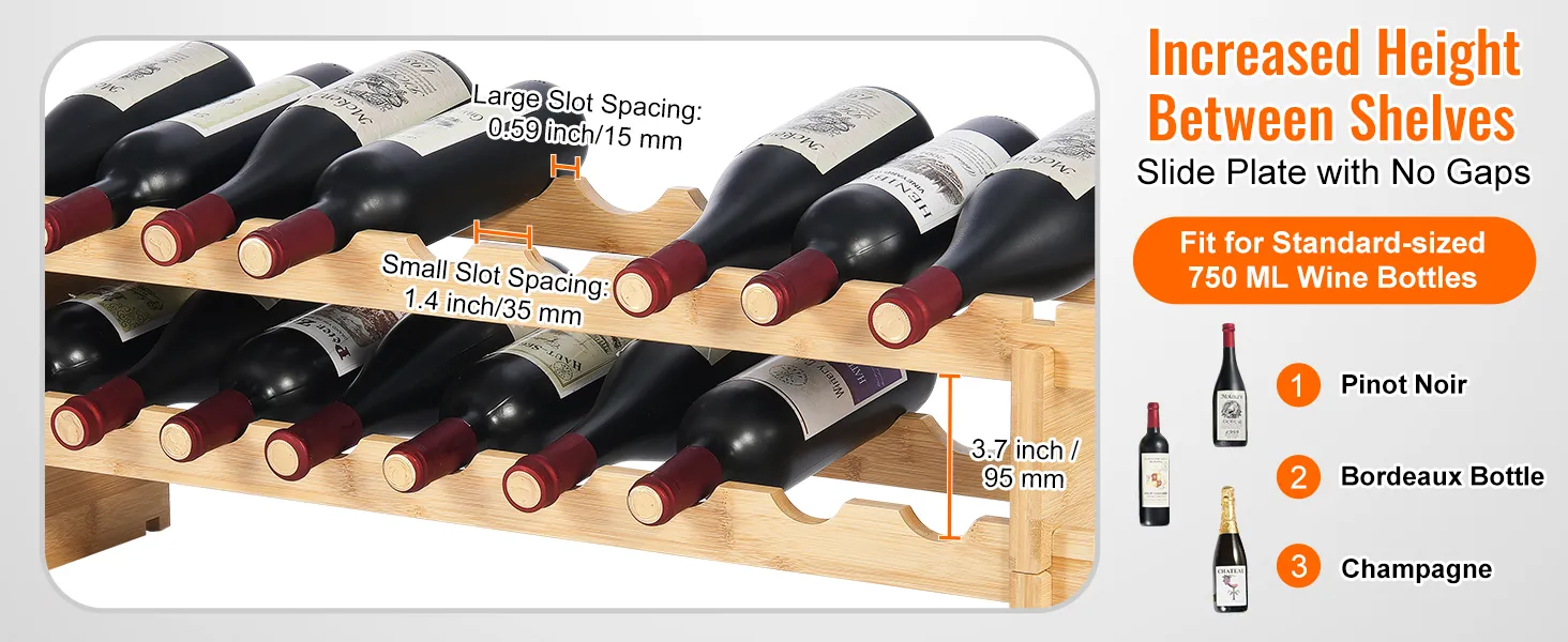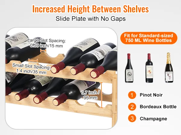 Stable Bottle Fit: The standard-sized wine bottles (750ML), such as Bordeaux and Champagne. This bamboo wine rack fits 90% of bottle sizes on the market. The height between shelves has been increased to 3.7 inches, allowing easy access to your favorite bottles.