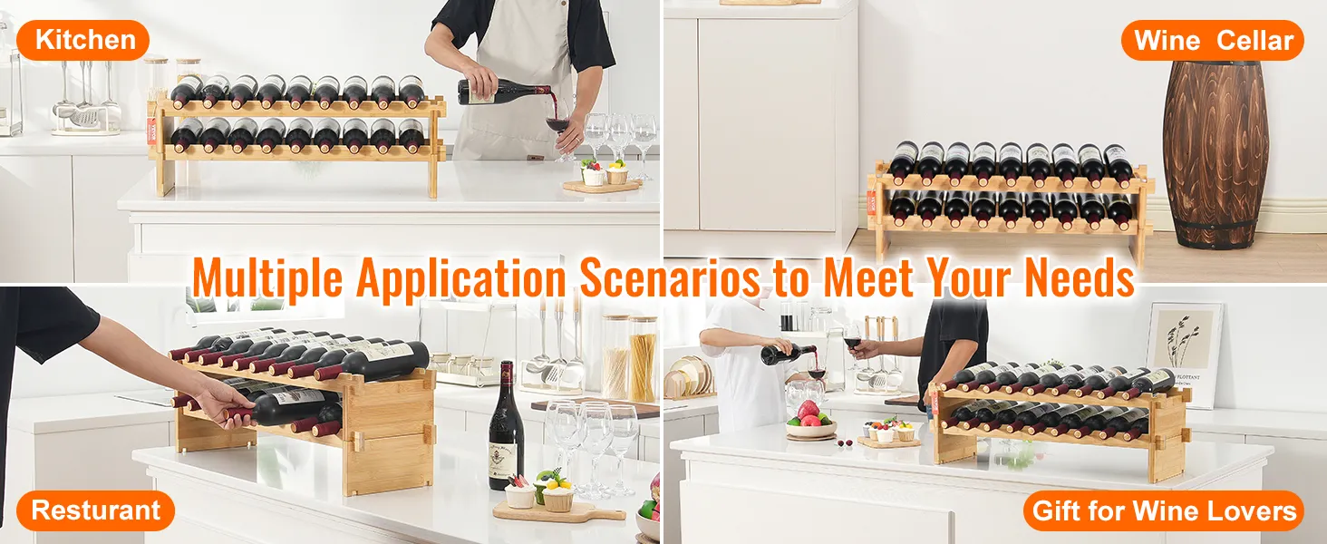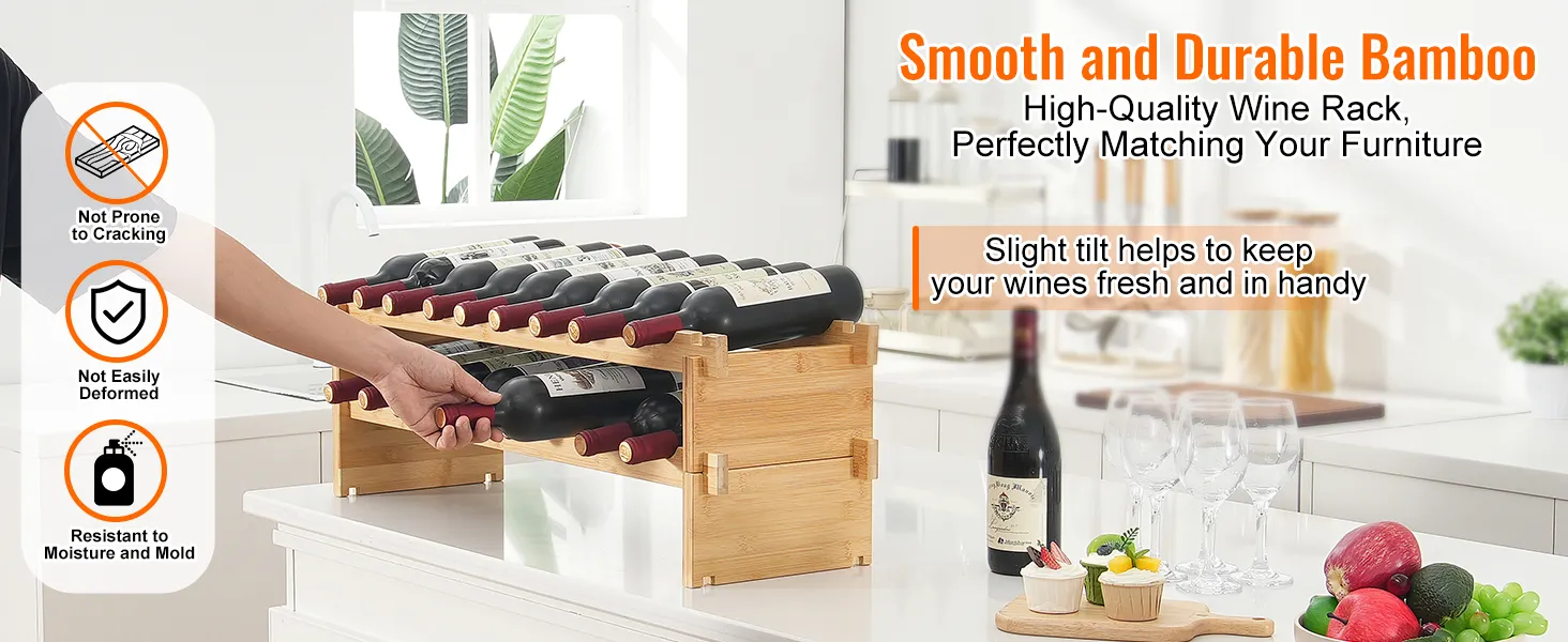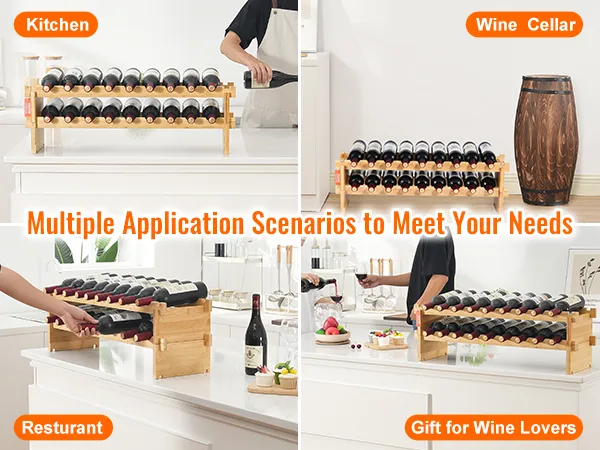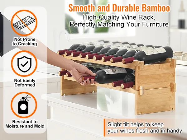 Natural Bamboo Wood: Our wine storage rack is made from high-quality bamboo, which is smooth, crack-resistant, and less likely to absorb moisture or mold. The natural bamboo has excellent resilience and supports wine bottles perfectly without wobbling.