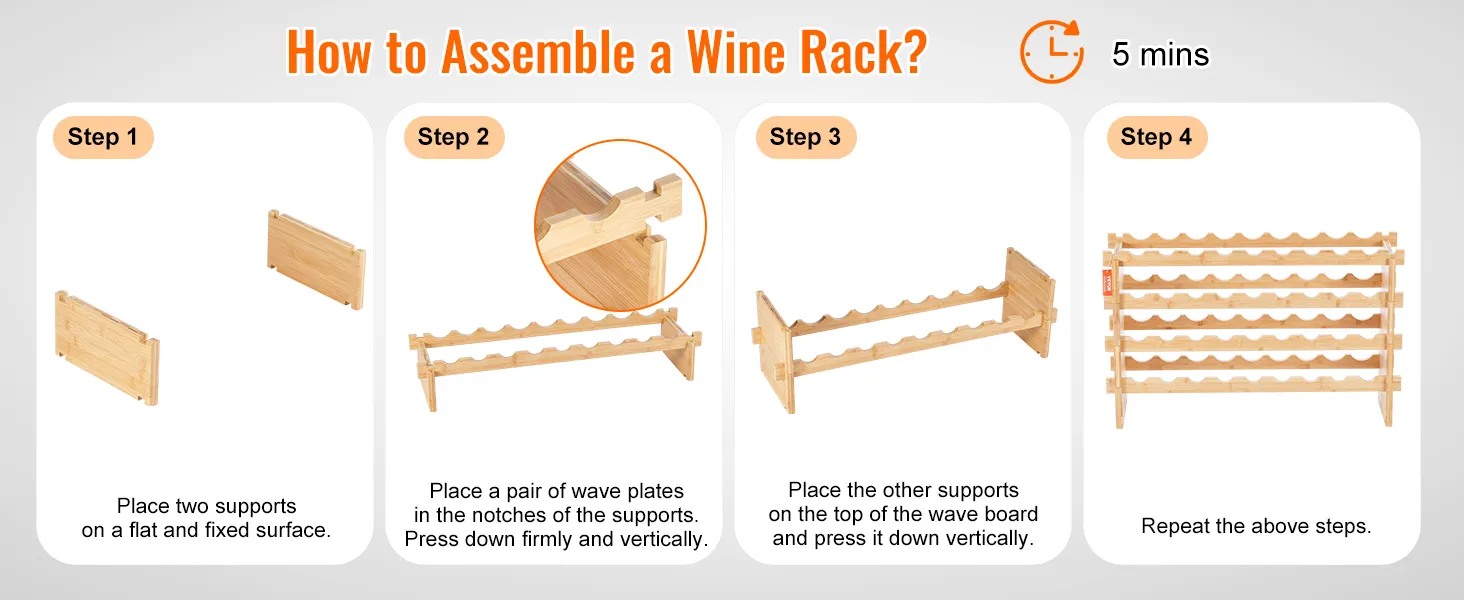 Hassle-Free Assembly: Assembling our freestanding wine rack is a breeze, taking just 5 minutes with no tools, nails, or screws required. It's very simple, but please make sure to check that all parts are correctly aligned before assembly. You can also stack it to your preferred number of layers.