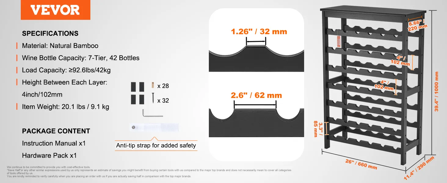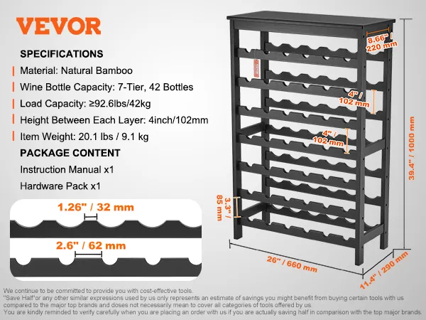 42-Bottle Bamboo Wine Rack: This wine rack measures approximately 26x11.4x39.4 inch (660x290x1000 mm) and holds up to 42 bottles (7 layers, 6 bottles per layer). An elegant and classic wine storage solution that complements any kitchen, dining room, wine cellar, or dining area. It is highly versatile and makes an excellent gift for wine enthusiasts and collectors. Please note, wine is not included.
