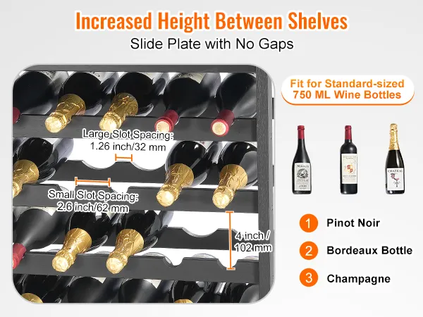 The standard-sized wine bottles (750ML), such as Bordeaux and Champagne. It fits 90% of bottle sizes on the market. The height between shelves has been increased to 4 inches for easy access to your favorite bottles.