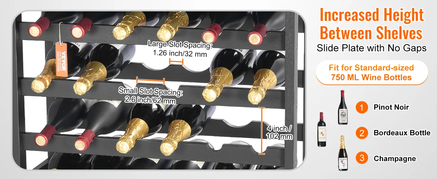 Continuous Placement: The standard-sized wine bottles (750ML), such as Bordeaux and Champagne. This bamboo wine rack fits 90% of bottle sizes on the market. The spacing between rack sections has been increased to 1.9 cm, providing ample room for stacking Pinot bottles or Champagne bottles.