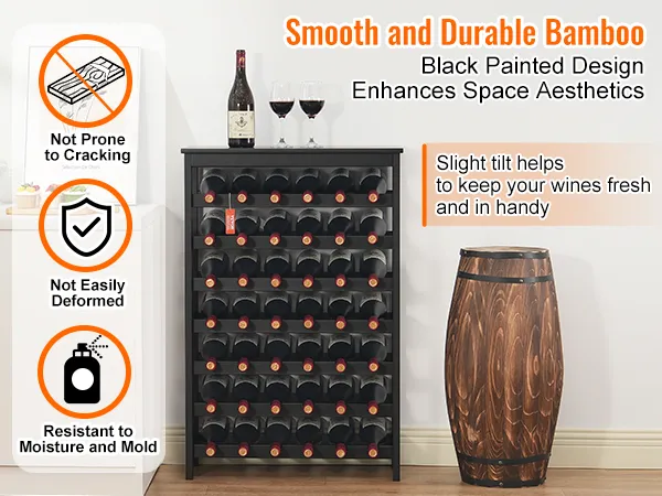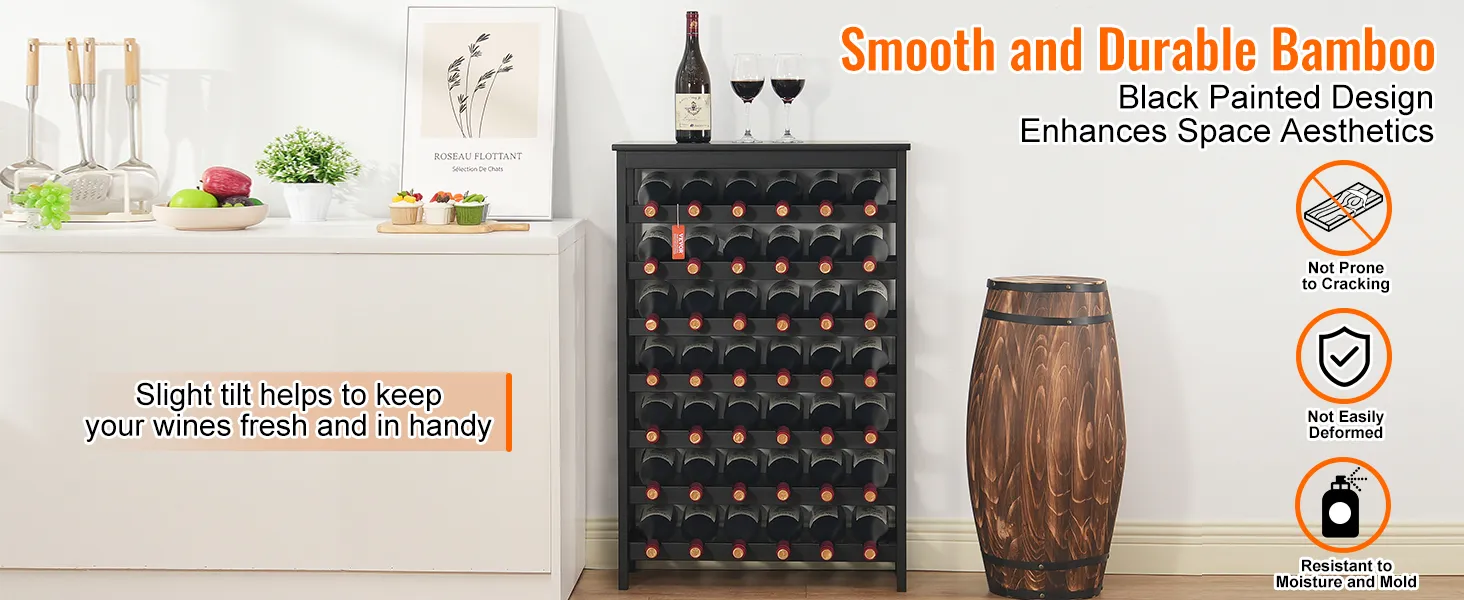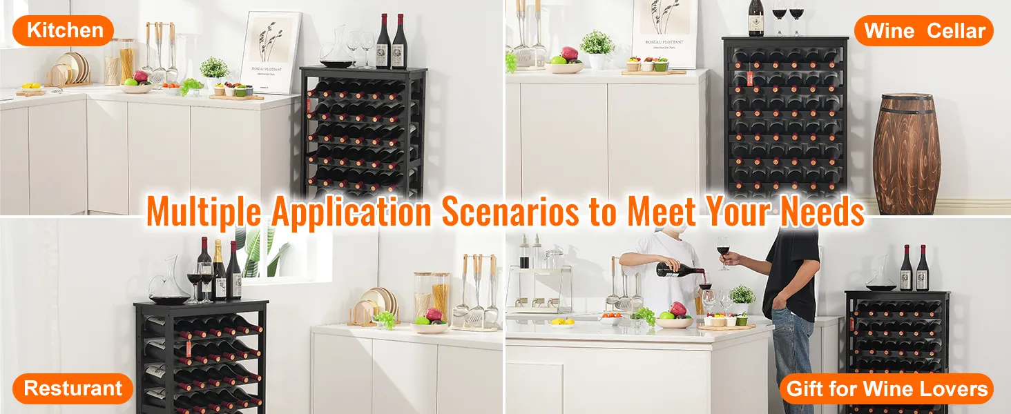 Natural Bamboo Wood: Our wine storage rack is made from high-quality bamboo, which is smooth, crack-resistant, and less likely to absorb moisture or mold. The natural bamboo has excellent resilience and supports wine bottles perfectly without wobbling.