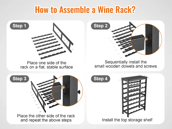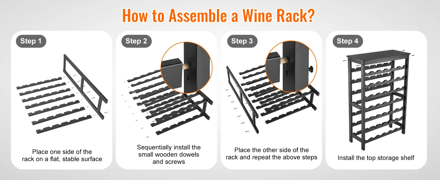 Hassle-Free Assembly: Assembling our freestanding wine rack is a breeze. Simply follow the easy instructions to tighten the screws, and you can set up the rack immediately. If you need to move the rack, be sure to remove the bottles first.