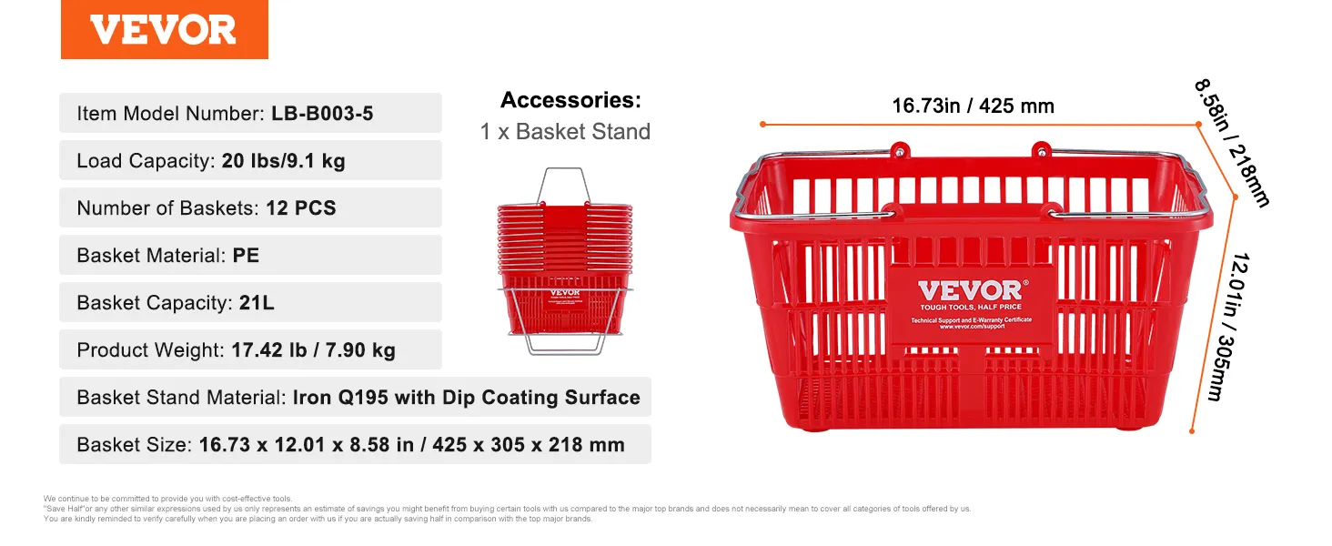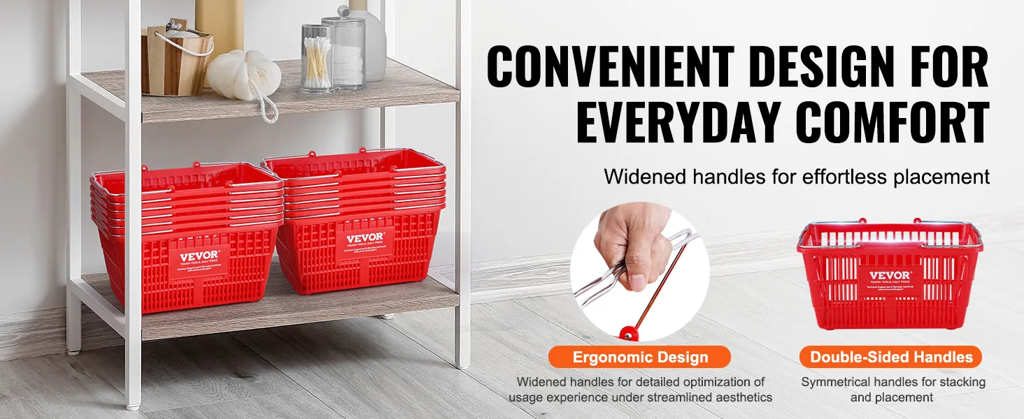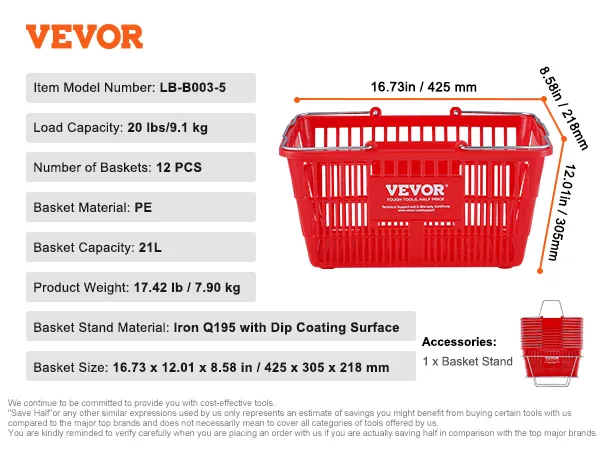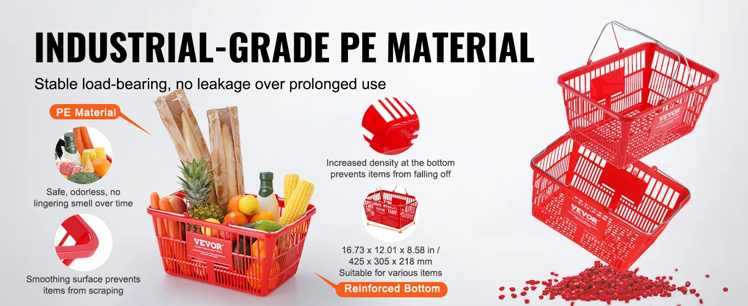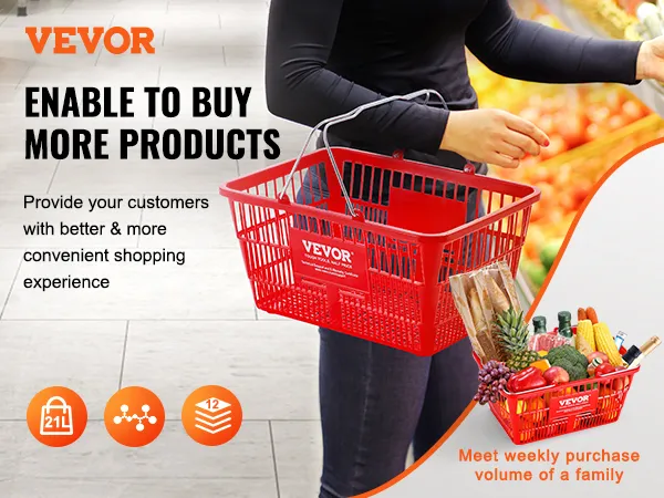 De VEVOR-winkelmand heeft een capaciteit van 21 liter. Dit is perfect voor gezinnen en zwaar winkelen. Premium PE-materiaal zorgt voor duurzaamheid en een glad oppervlak om uw artikelen te beschermen. De mand kan tot 20 pond aan zonder problemen. Ontworpen om een week aan boodschappen te bevatten, is het ideaal voor het bewaren van fruit, groenten, shampoo en verschillende boodschappen. De stevigheid en geurloze aard maken het een betrouwbare keuze voor uw winkelbehoeften. Een set van 12 maakt het gemakkelijk om te delen en zorgt ervoor dat iedereen zijn eigen mand heeft.