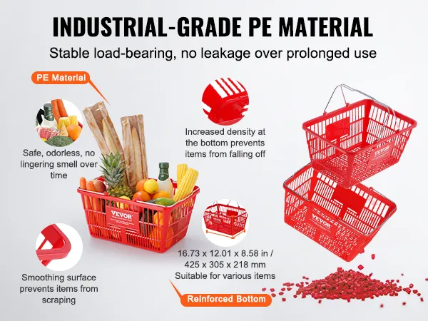 De VEVOR plastic boodschappenmand is erg stevig en duurzaam. Het heeft een glad oppervlak dat uw spullen beschermt en een verstevigde bodem voor extra veiligheid. Het materiaal is ook geurloos, waardoor het prettig is om te winkelen. De mand kan tot 20 pond aan zonder problemen. Dus is het ook betrouwbaar voor zware lasten. Deze duurzaamheid zorgt ervoor dat de mand in goede staat blijft na verloop van tijd, wat zorgt voor langdurig gebruik.